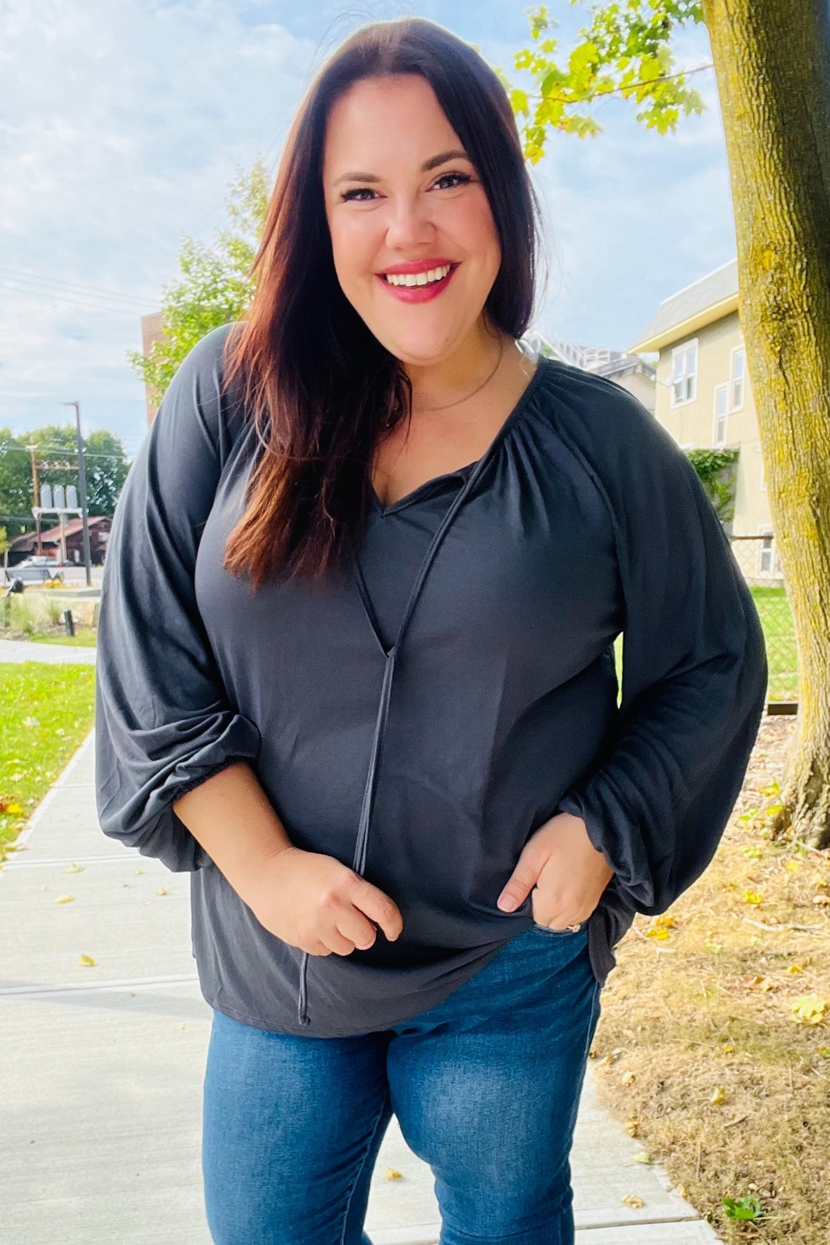 Make a fashion statement this fall while staying cozy in this super soft modal knit peasant top with front tie strings. With long elastic bubble sleeves, pare with a jean jacket for autumn.