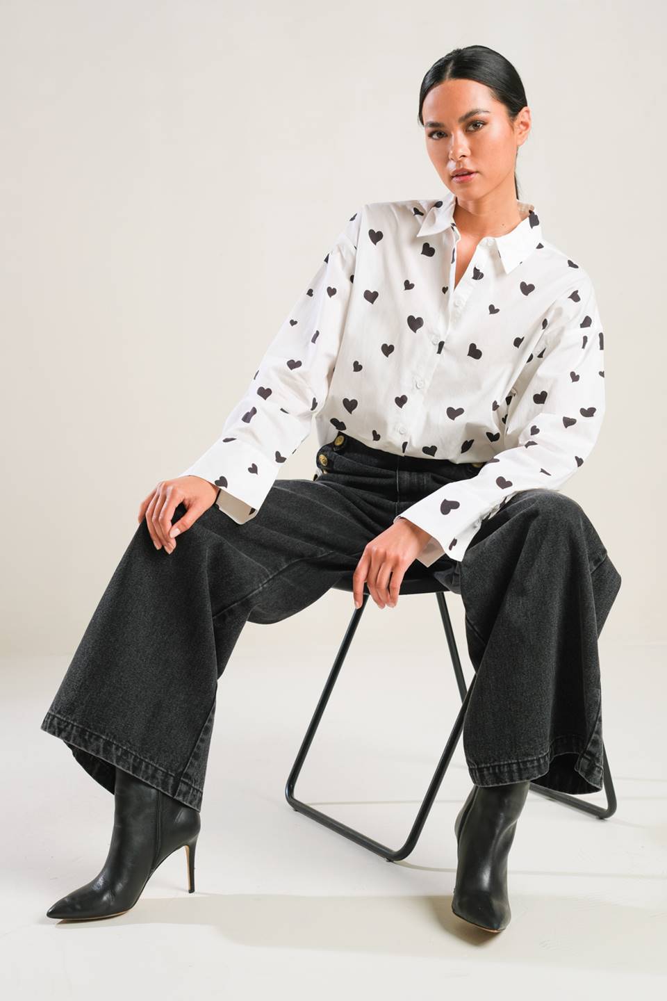 A printed woven top with long sleeve and front button down closure