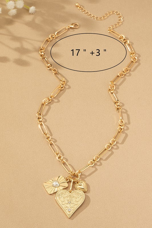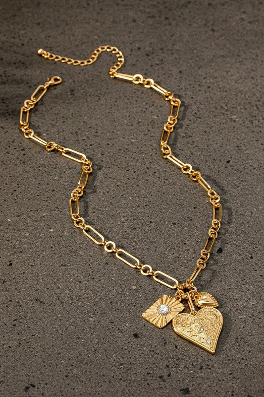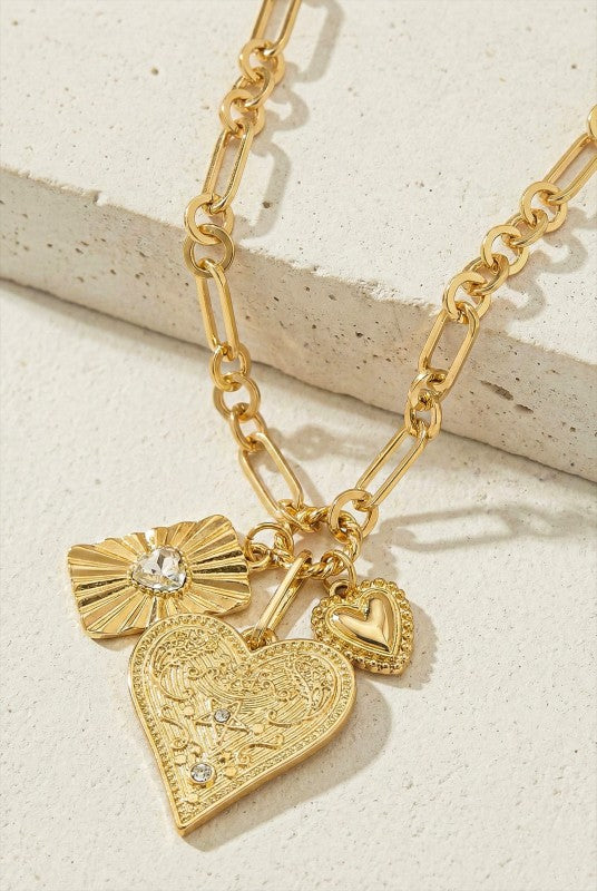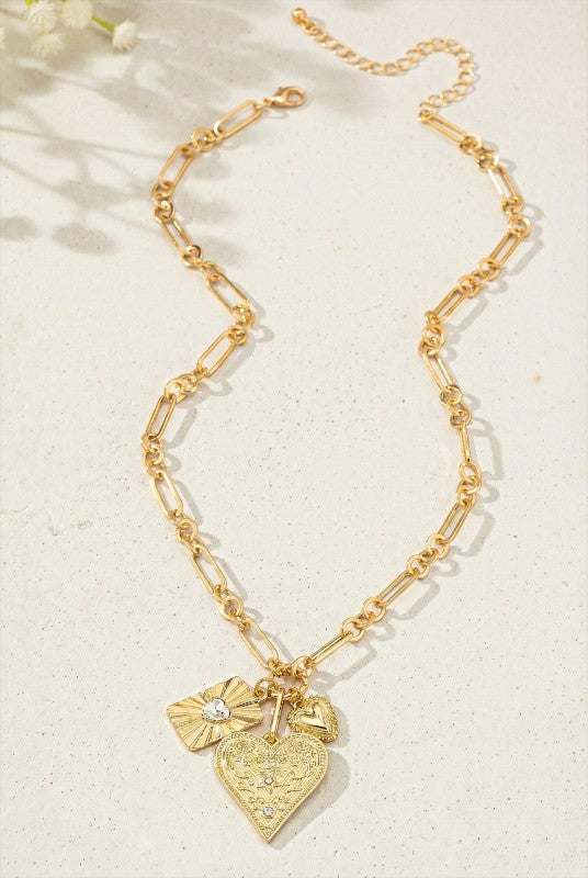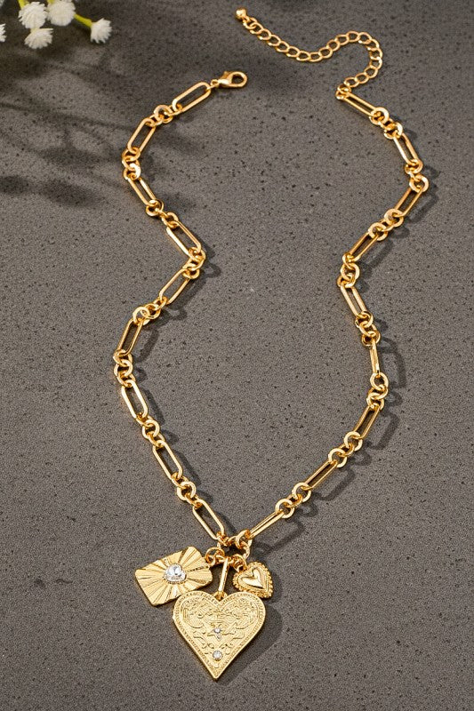 3 heart charm cluster necklace on a unique chunky link chain