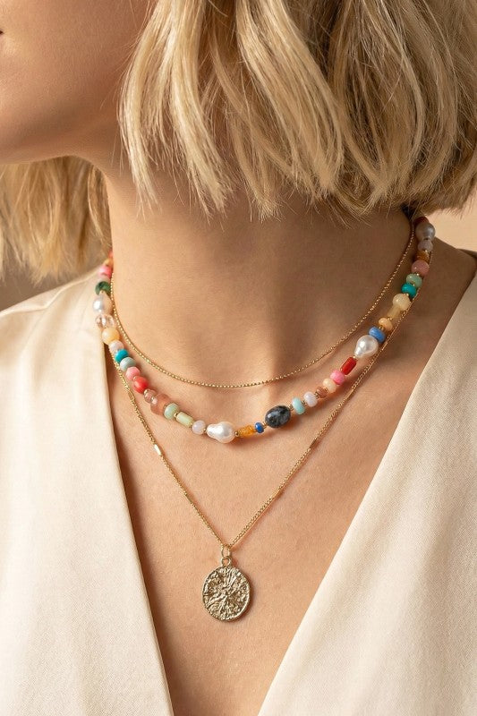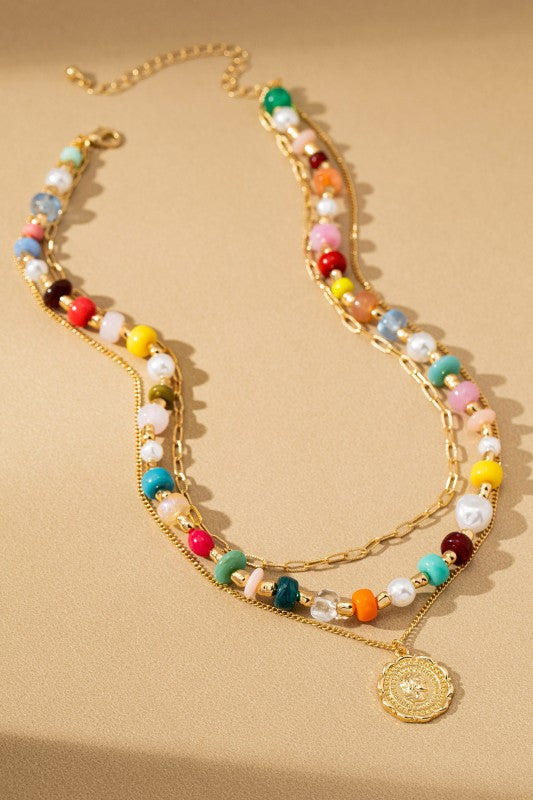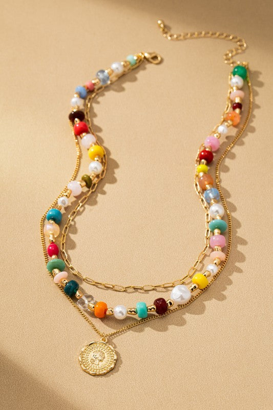 **Multicolor Beaded Layered Necklace with Coin Pendant**