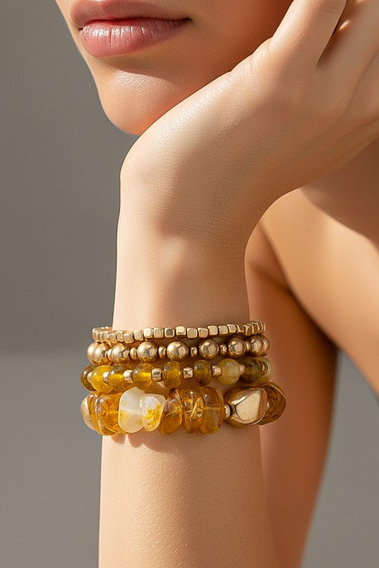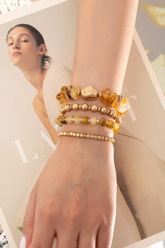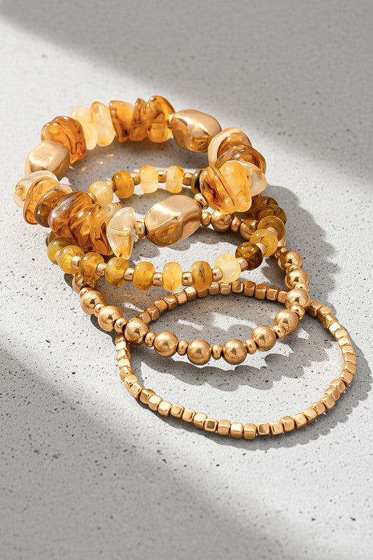 A beautifully coordinated 4-piece stretch bracelet set featuring warm amber-inspired resin beads and polished gold-tone metal accents. Each strand has its own distinct texture and bead shape - from chunky organic resin nuggets to smooth round beads and petite gold cubes - creating a rich, layered look when worn together.
