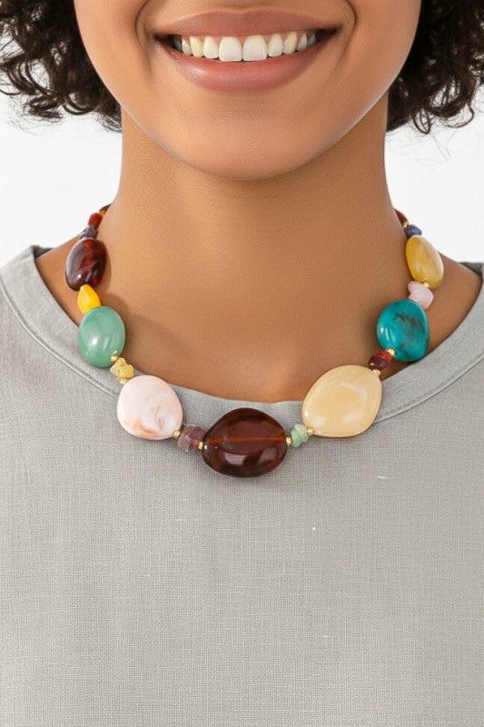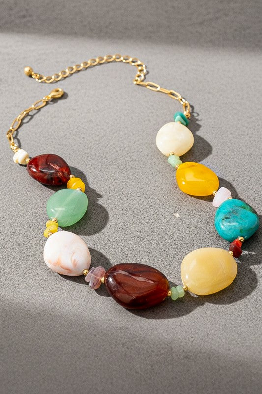 Elevate your look with this captivating Artisan-Crafted Multi-Stone Statement Necklace. A true fusion of vibrant color and elegant design, this piece features a dazzling array of large, polished, cabochon-style resin beads in a rich spectrum of hues, including deep burgundy, sunny yellow, cool jade, creamy marble, and vivid turquoise.