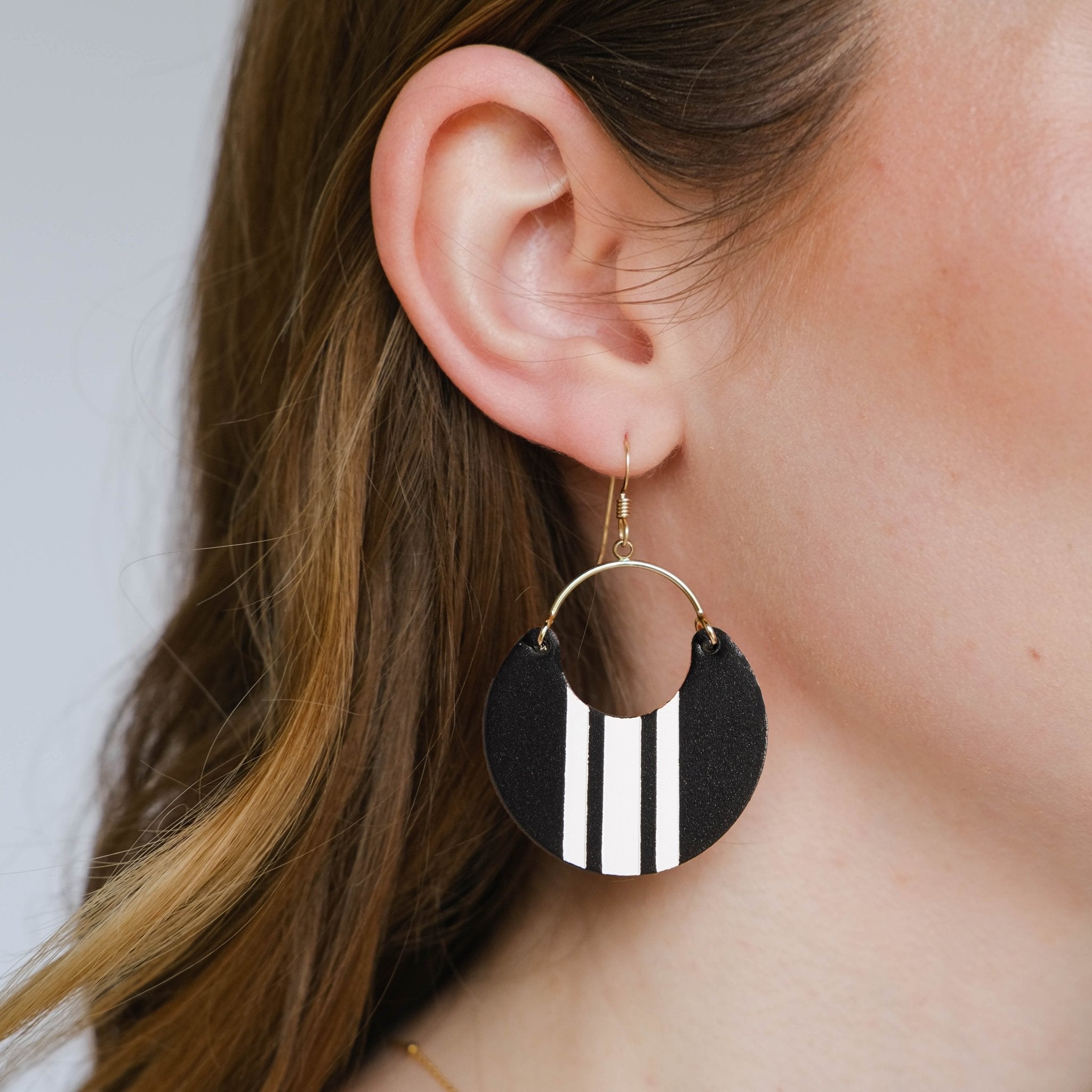 These stunning earrings are handmade from premium smooth black leather and are designed with a sporty twist, featuring three sleek white hand-stamped stripes down the center of the earring. Available on gold or silver hardware, they are versatile and can be paired with any outfit as a statement neutral.
