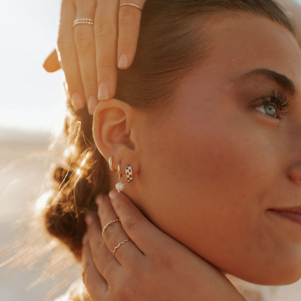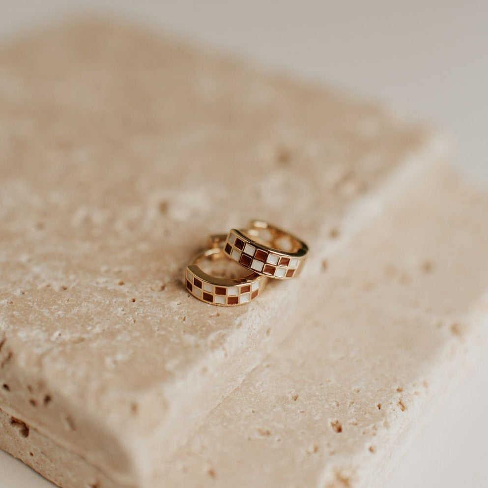 The Brown & White Checkered Hoops are made of high quality gold fill and are hypoallergenic and good for sensitive ears. They have a huggie closure style and are the cutest new jewelry trend! Outer diameter is 10mm.