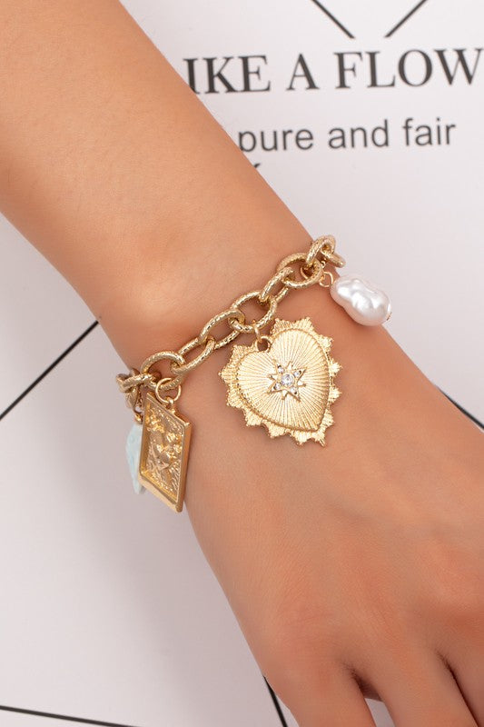 This gold-tone charm bracelet blends playful and symbolic elements, featuring a blue ceramic fish, a Lover-themed tarot card, faux pearl, radiant heart with crystal center, and other textured gold charms. The mix of materials adds depth and meaning to its boho-chic style.