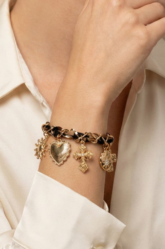 Five dangling charms complete the design, including a sunburst, a textured heart, two ornate cross motifs, and an irregular gold medallion with a small star detail.