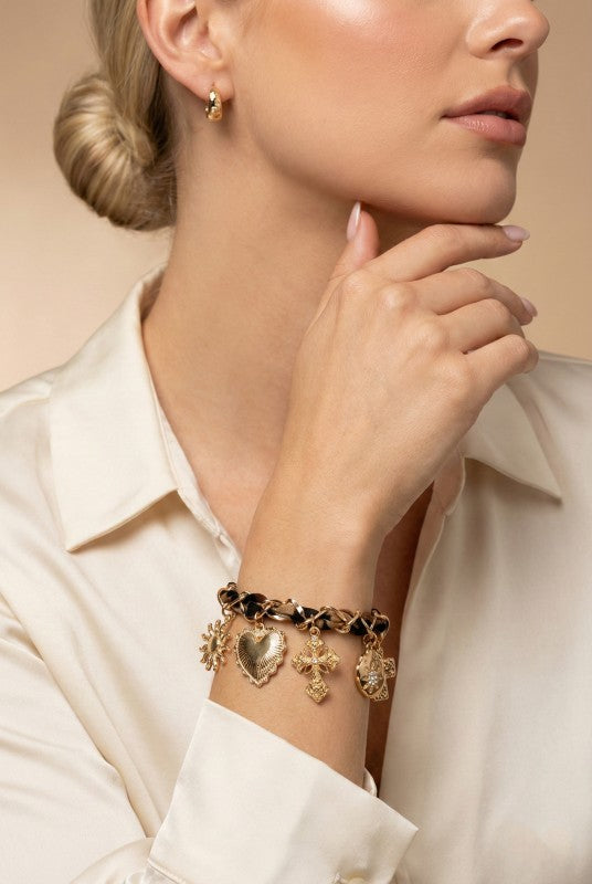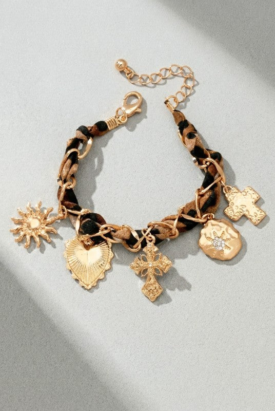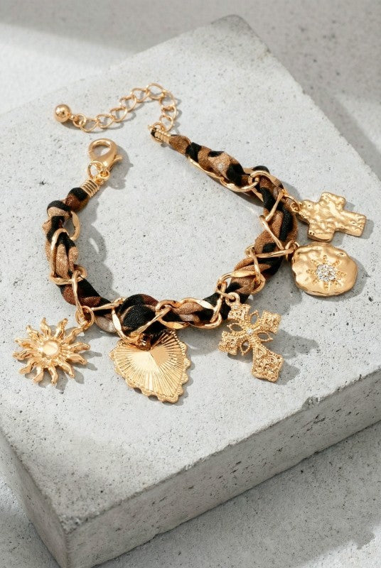 Gold-tone charm bracelet featuring a chunky link chain woven with leopard print fabric for added texture and dimension.