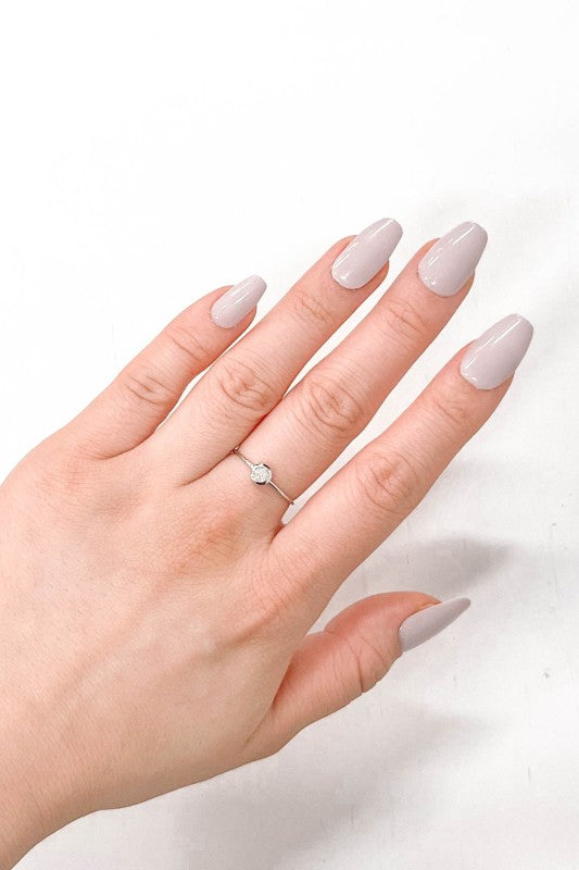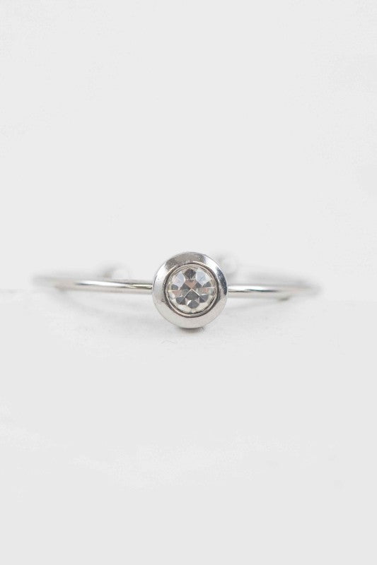 A circle charm with a round stone on a thin silver adjustable band.