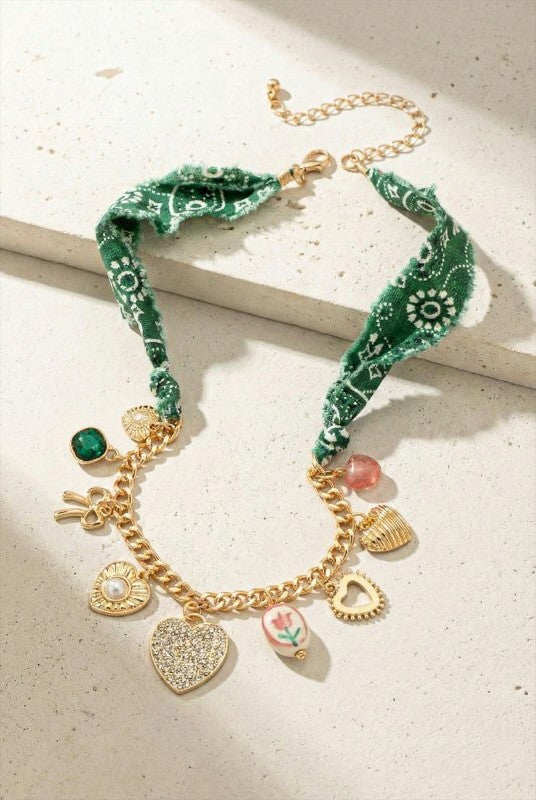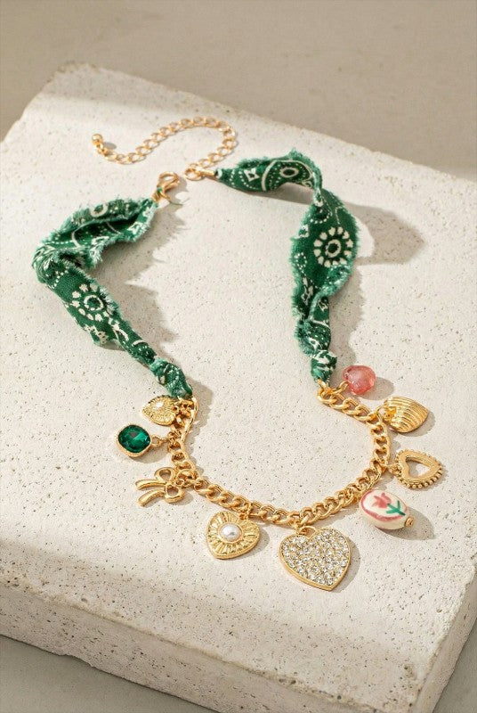 A statement charm necklace featuring a soft green bandana-style fabric paired with a polished gold-tone chain and an eclectic mix of heart and symbol charms. The design blends casual fabric texture with glossy metallic details for a playful yet elevated look. An adjustable extender allows for flexible styling and comfortable wear.