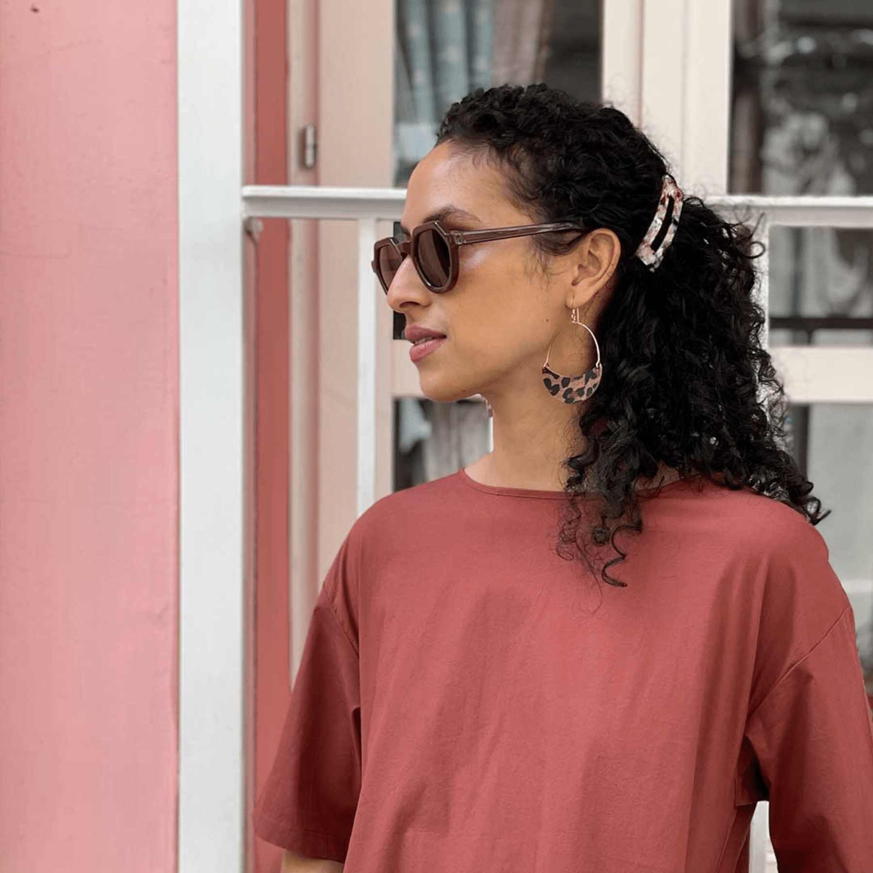 Asters are a lightweight take on the classic hoop earring with a crescent leather accent. This style is crafted from premium animal print leather, with a slight swinging movement and versatile wear-everywhere style. There may be slight pattern variation within pairs, as each earring has a unique section of print.