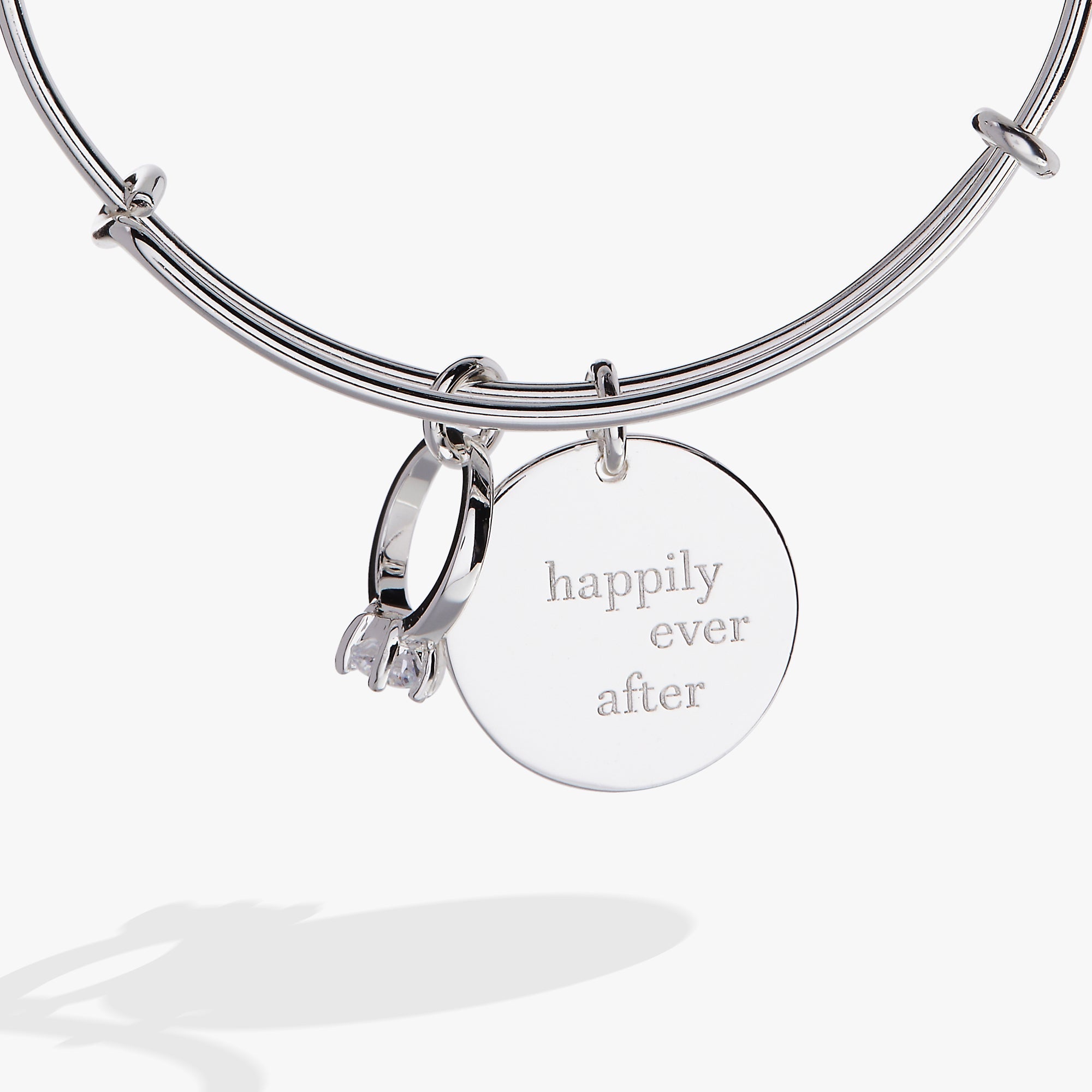 It’s the start of a beautiful love story. This “Happily Ever After” Duo Charm Bangle features two charms: a circular charm engraved with “Happily Ever After,” and an engagement ring charm accented with a sparkling clear crystal, both on an expandable wire bangle bracelet. Wear it — or gift it — to celebrate new beginnings and promises to last a lifetime.