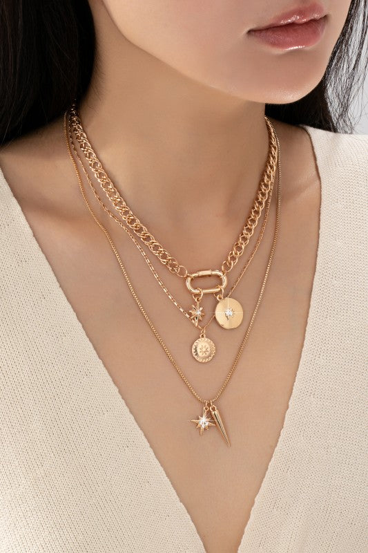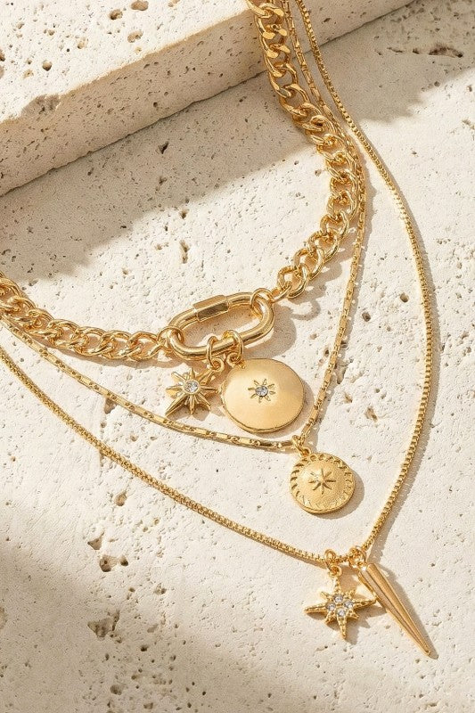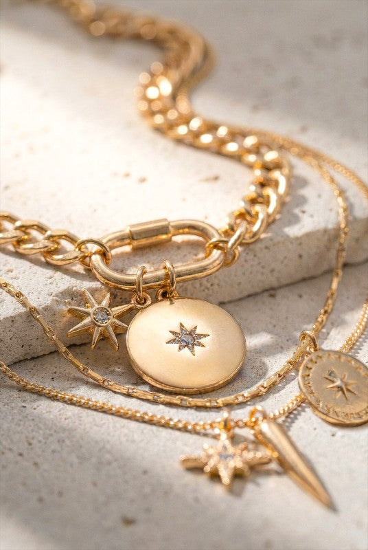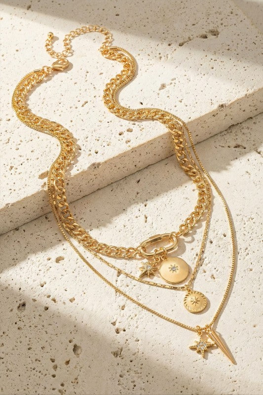 This three-layer gold-tone necklace combines bold texture with delicate celestial details for an effortlessly layered look. The top layer features a polished curb chain that adds structure and shine. The middle layer pairs a slimmer chain with a smooth round sunburst disc accented by a tiny crystal at the center.