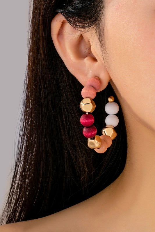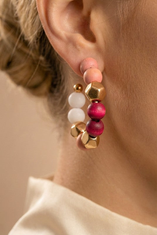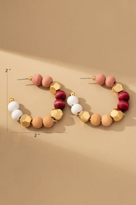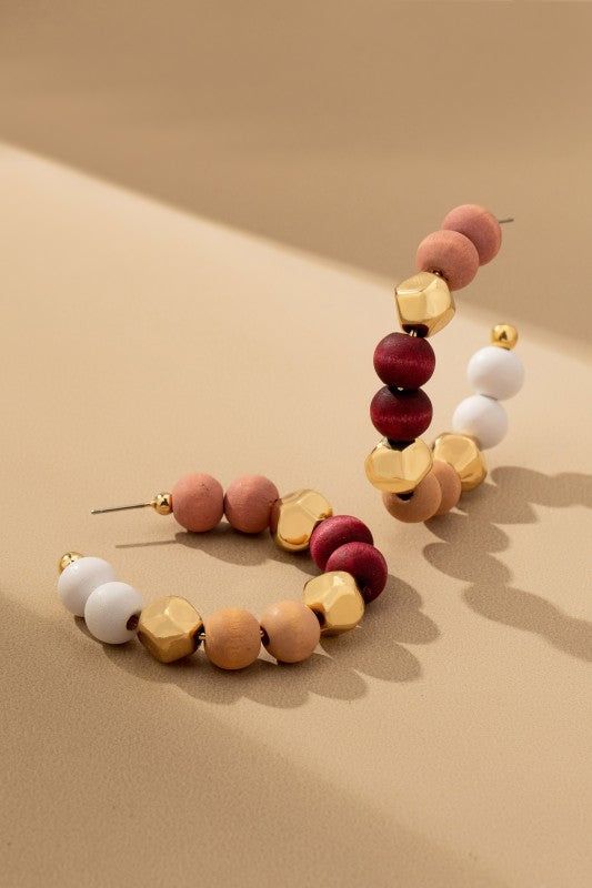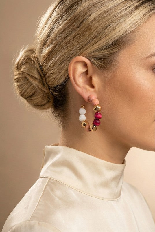 Statement hoop earrings crafted with a harmonious mix of matte wooden beads, polished gold-tone accents, and faceted metallic elements. The warm neutral tones are balanced with subtle pops of white and deep red, creating a modern yet earthy aesthetic. Lightweight and visually striking, these hoops add texture, color, and effortless sophistication to both casual and elevated looks.