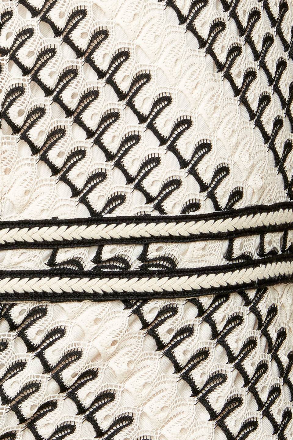 A black & white crochet midi dress featuring round neckline, sleeveless, A-line skirt and back zipper closure.
