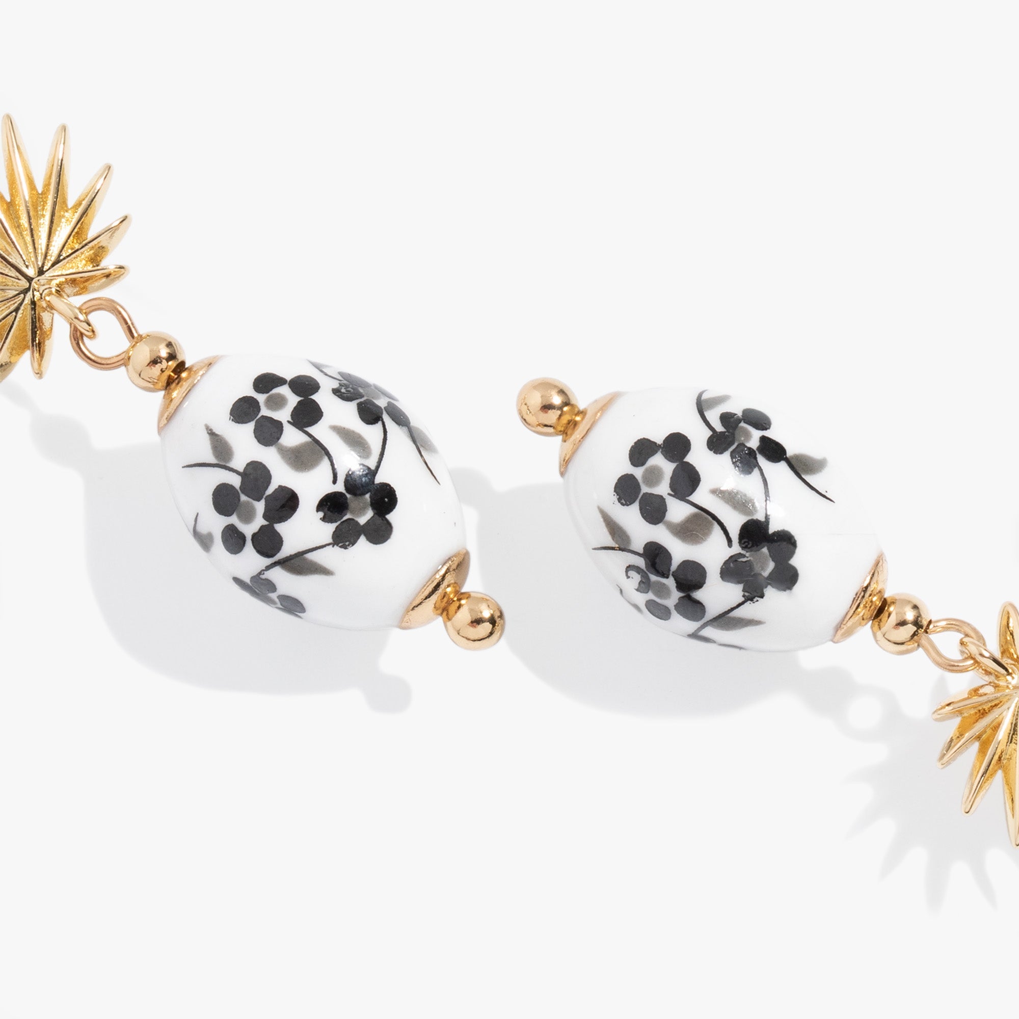 The Toile and Palm Drop Earrings will be the foundation of your luxuriously laid-back look this season. Think evening dinners on the patio while sipping your drink of choice out of a fun glass and trying to remember to take the IG food picture before you dig in. These intricately detailed drop earrings feature a hand-painted toile floral pattern and a golden-hued palm frond anchor.