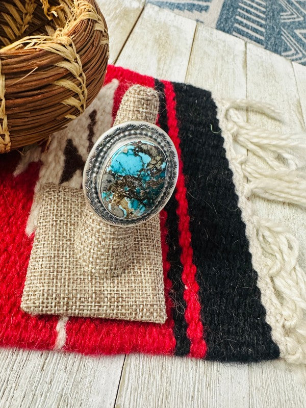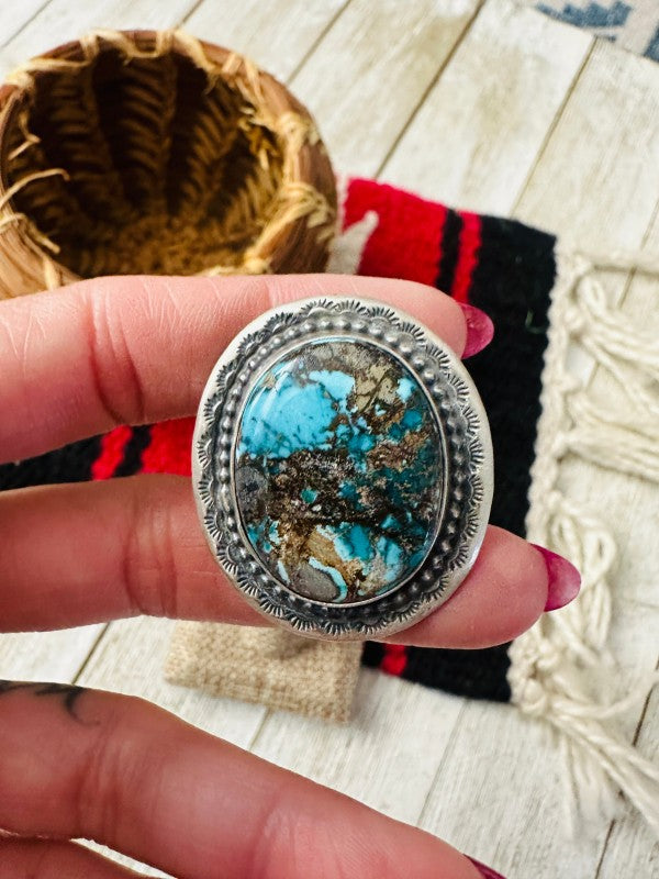 Beautiful Handcrafted Sterling Silver and Turquoise Ring. Size 7. Measures 1 5/8 inches long and 1 3/8 inches wide. Signed by the artist and stamped Sterling.