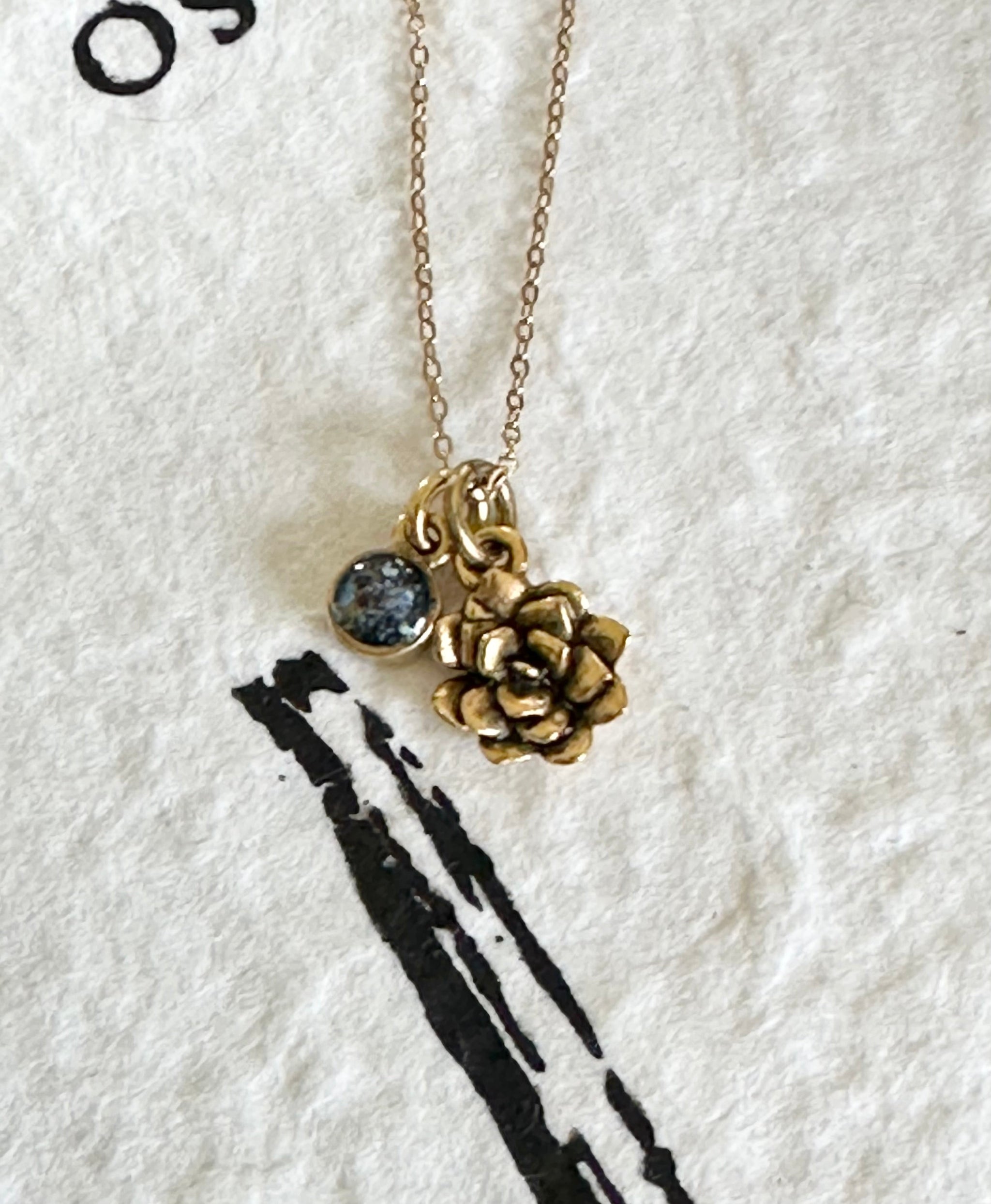 Artisan made Succulent Charm hangs from a stainless steel chain along with a crushed gemstone tiny charm