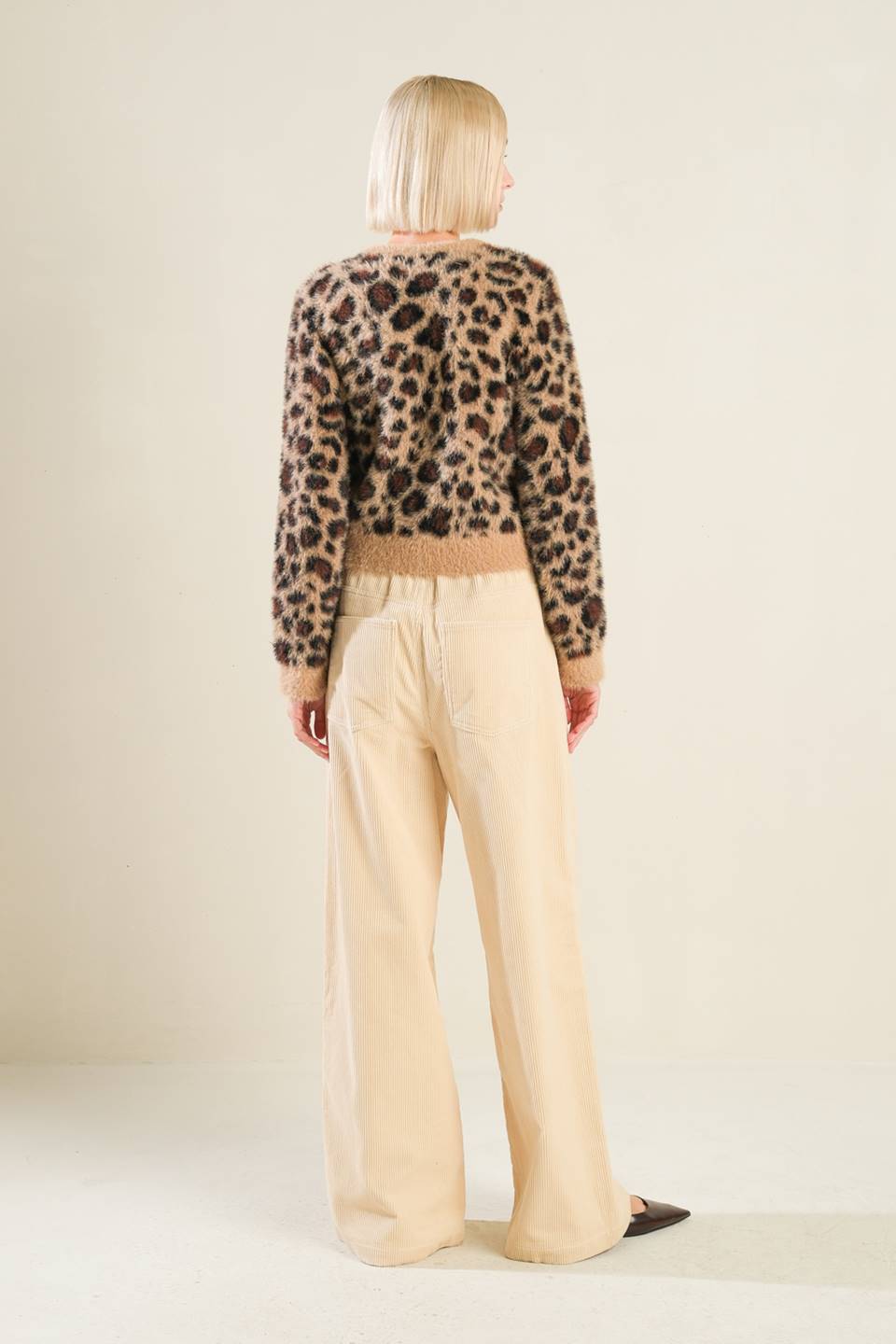 An eyelash jacquard knit sweater cardigan with front button closure