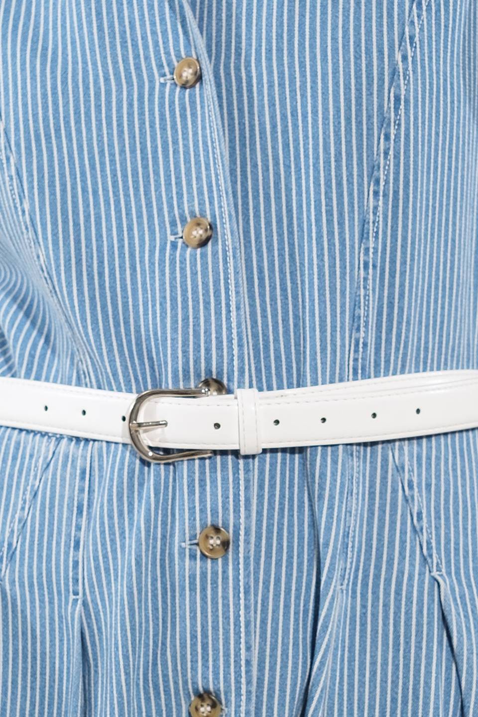 A striped denim midi dress featuring collar, button down, cuffed short sleeve, button down, belt, side pocket and full skirt