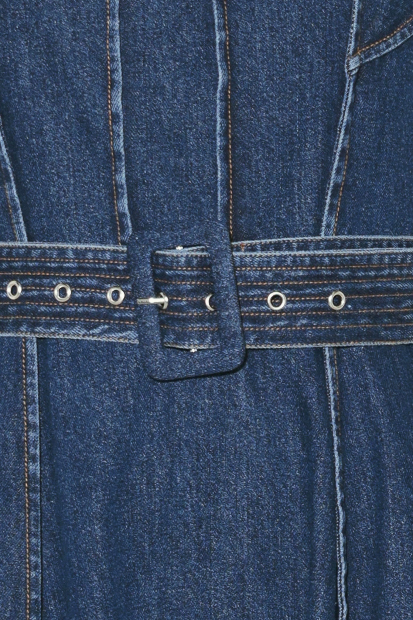 A washed denim midi dress featuring straight neckline, straps, self belt, circle skirt and back zipper closure