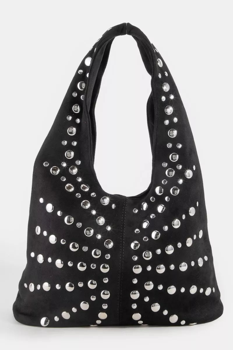 The Grommet Studded Suede Shoulder Bag is a fashion-forward accessory that adds a touch of edgy sophistication to your look. Featuring grommet and studded detailing, this shoulder bag offers a trendy and modern vibe. Crafted from suede material, it exudes a luxurious and textured appeal. The shoulder bag design provides practicality and style, making it a versatile piece for various occasions. Elevate your outfit with this stylish and statement-making shoulder bag that effortlessly combines fashion and functionality.