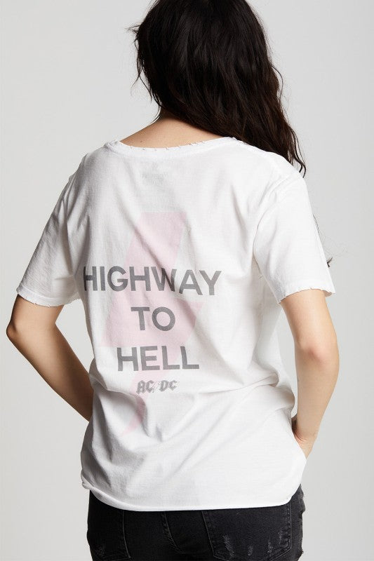 This tee reworks the Highway to Hell aesthetic with a bold lightning bolt design across a vintage washed white base at the back. The front print is the band's logo and the 1979 World Tour. It feels raw and powerful, much like the album it honors, while the lived-in fabric and comfortable boyfriend fit make it an easy everyday t-shirt.