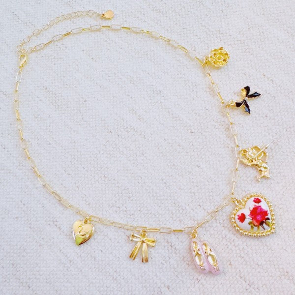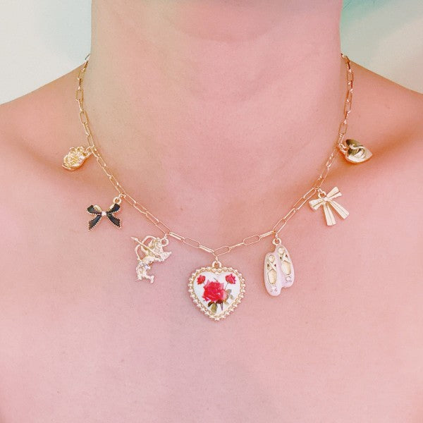 Add a touch of enchantment to your jewelry box with the Ballet Garden Charm Necklace. This whimsical piece features an array of delicate charms—like ballet slippers, florals, ribbons, and more—capturing the grace of dance and the beauty of a blooming garden in one dreamy necklace.