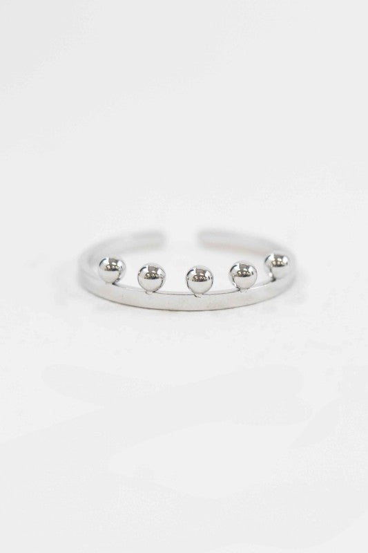 Five ball charms on top of a silver adjustable band.