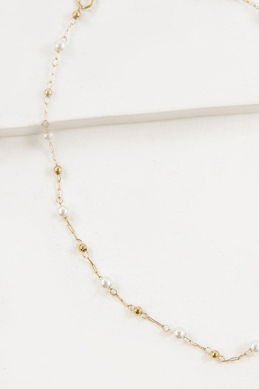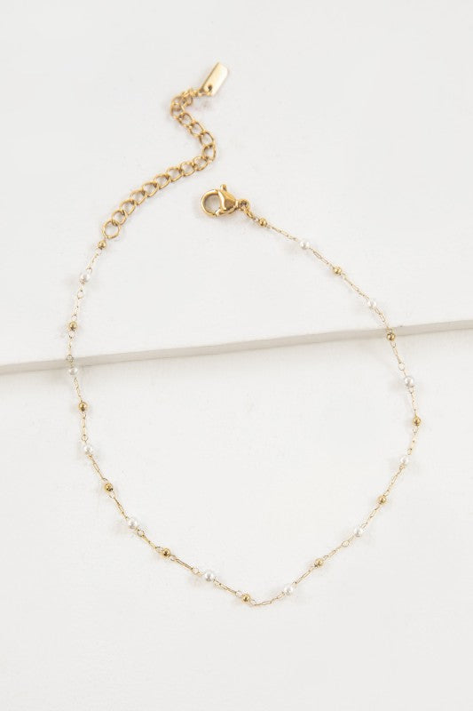 A simple chain anklet linked with mini pearls and gold beads .
