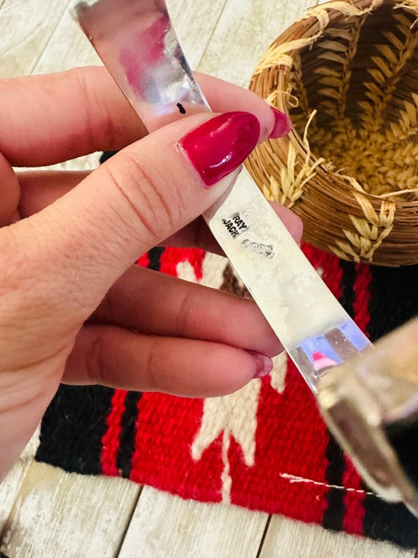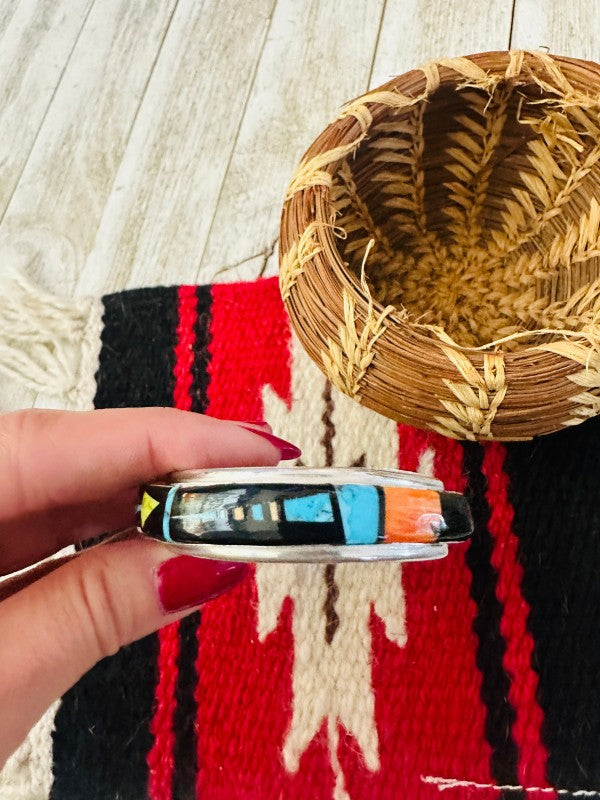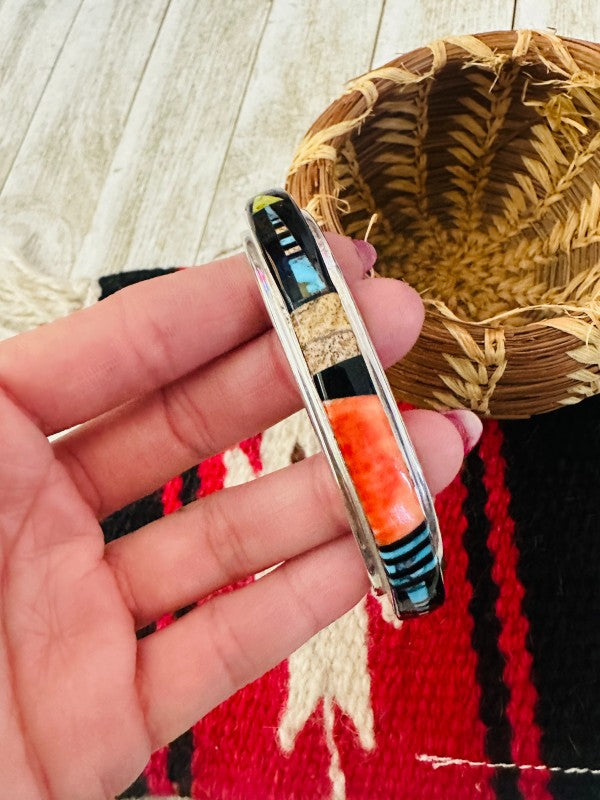 Beautiful Handcrafted Multi Stone and Sterling Silver Inlay Arrow Cuff Bracelet. This cuff has an inside circumference 5 3/4 inches with a 1 3/4 inch gap. Width is 5/8 of an inch. Stamped Sterling and signed by the artist Ray Jack.