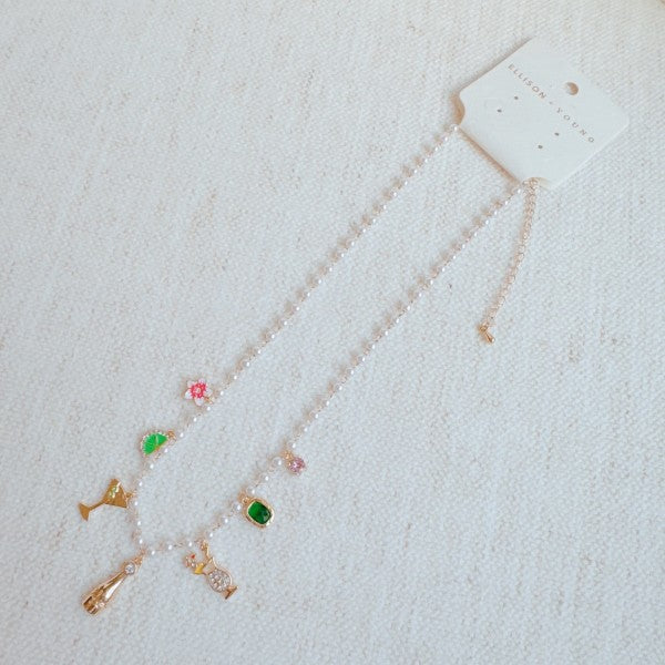 This necklace is adorned with chic and fun celebration charms, this necklace is perfect for layering and adding a touch of style to any outfit. The ultimate accessory for those who love to celebrate in style.