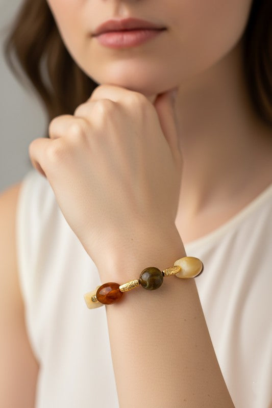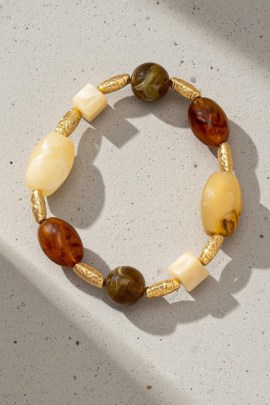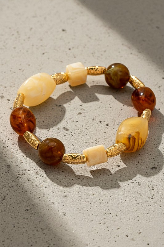 A beautifully balanced bracelet featuring a mix of honey-toned amber resin beads, creamy marbled resin pieces, and ornate gold-tone carved spacers. Each bead has its own unique swirl pattern, creating a natural, organic look that feels both earthy and elegant. The warm amber hues contrast softly with the ivory tones, while the textured gold spacers add a touch of richness and detail.