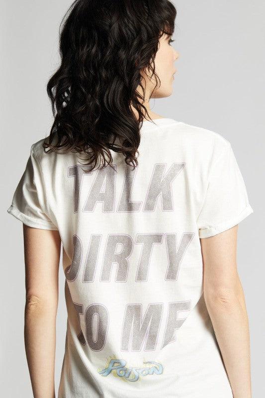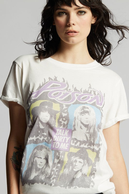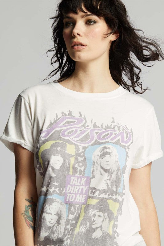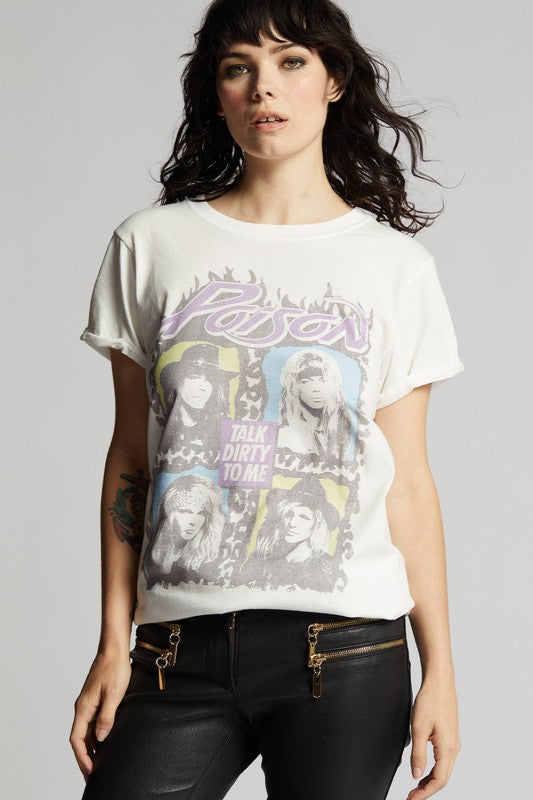 This tee is based off of one of Poison's top hits, \"Talk Dirty To Me\". The tee's design contains a colorful grid with photos of all of the band members with the band and song name on the front and the back. This tee is composed of soft cotton with a ribbed crew neckline, popular fitted style, slightly cuffed sleeves, and distressed edges.
