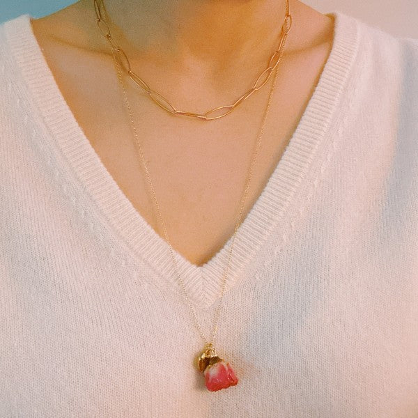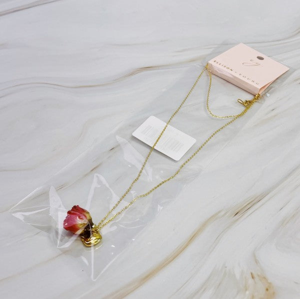 This necklace features a coated real rose bud pendant with golden heart charm, making it a truly one-of-a-kind piece. Add a touch of elegance and beauty to any outfit with this stunning necklace.