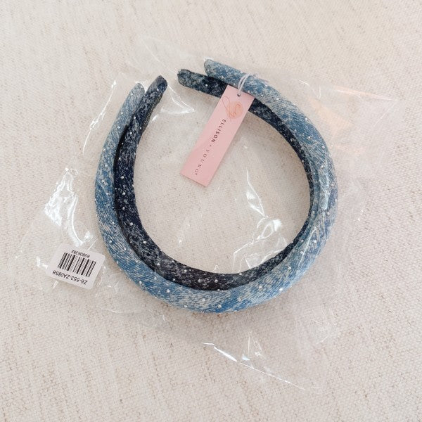 This headband features a modern slim jean design for a chic look and a touch of shine for added glamour. Elevate your style with this versatile and stylish set.