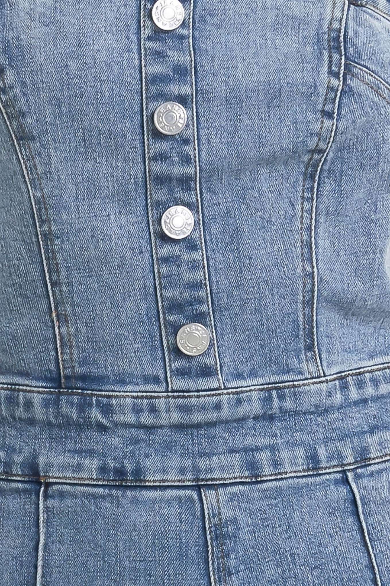 A washed denim jumpsuit featuring strapless, front button detail, wide leg and back zipper closure