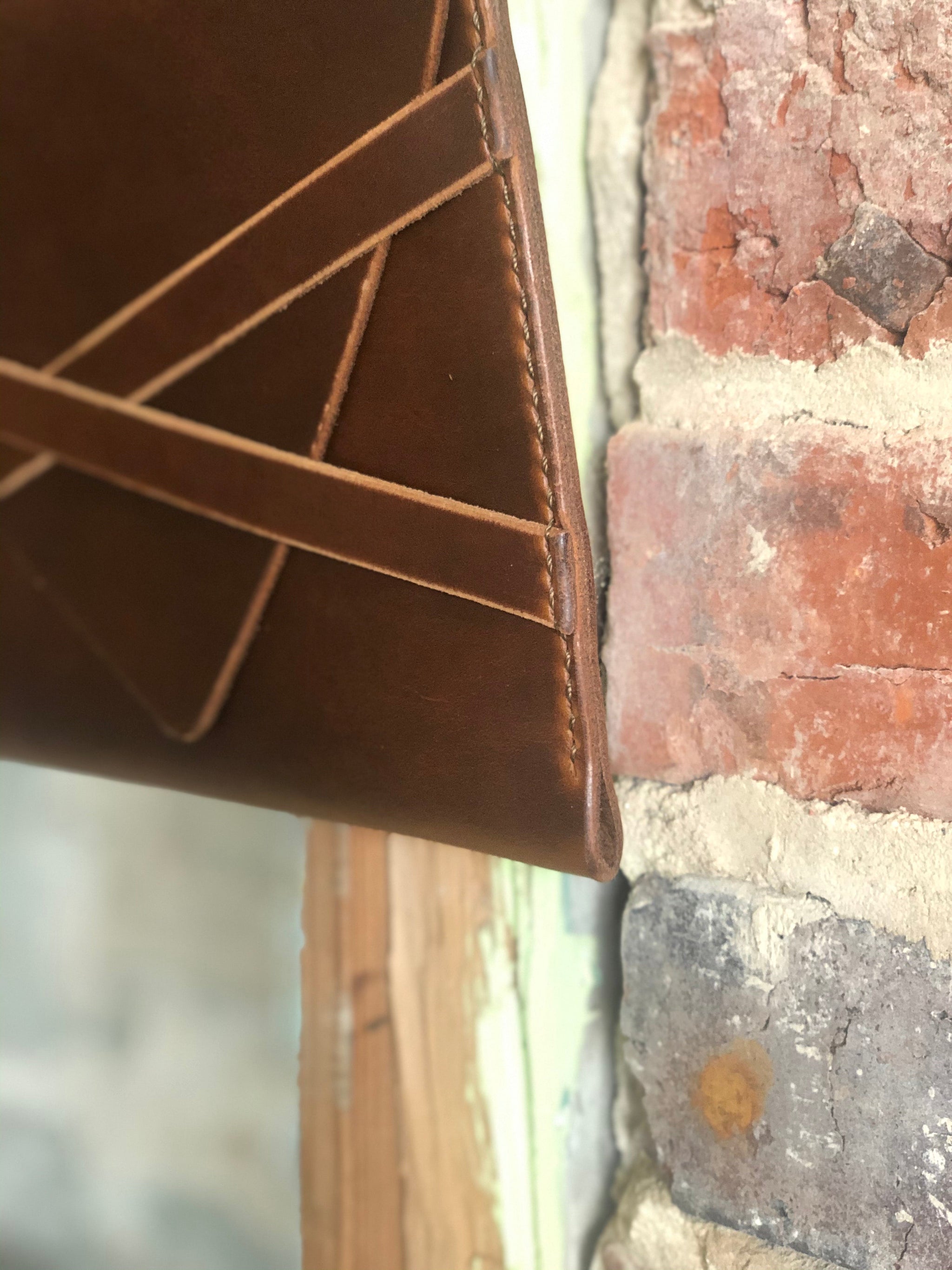 Handsewn leather purse with a double strap feature for a tuck and fold closure.