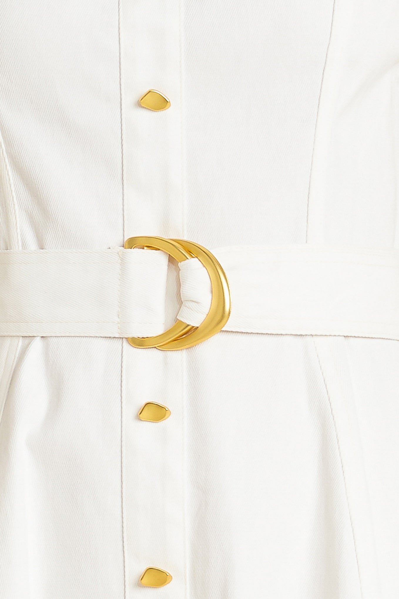 A solid woven midi dress featuring sweetheart neckline, sleeveless, front button down, self belt and circle skirt