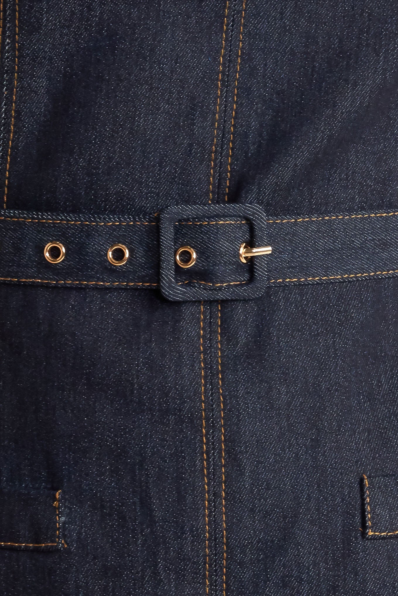 A denim midi dress featuring round neckline, sleeveless, self belt, circle skirt and back zipper closure