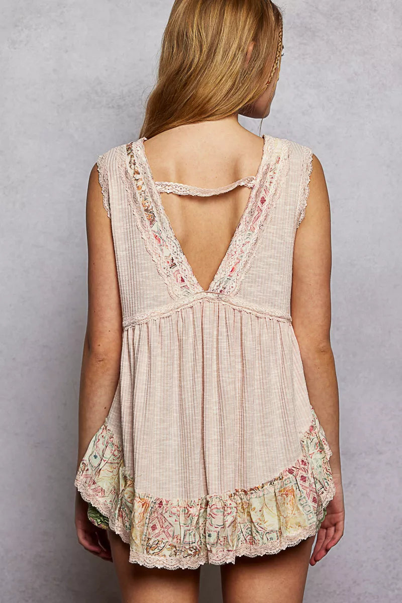 Lace Detail Ruffled Ribbed Sleeveless Top with Floral Pattern Trim Detail