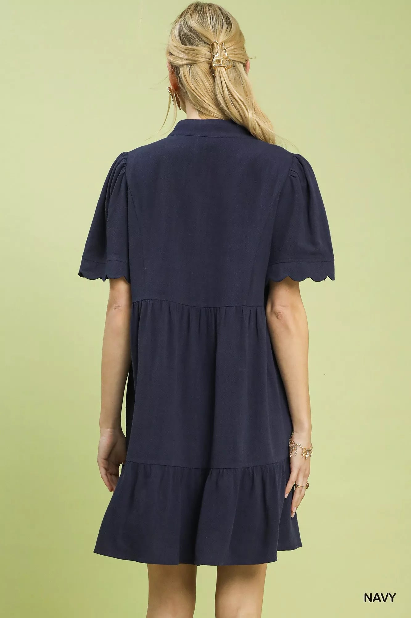 This linen tiered babydoll dress is a versatile and stylish choice, featuring a split V-neck and short scalloped sleeves for a feminine touch. The practical pockets add functionality to the design, while the lining enhances comfort and coverage. Perfect for a casual and effortless look, the dress combines comfort with chic style. The tiered silhouette adds dimension and movement to the outfit, making it a flattering and easy-to-wear option for various occasions. Ideal for a relaxed and fashionable ensemble that exudes charm and comfort.