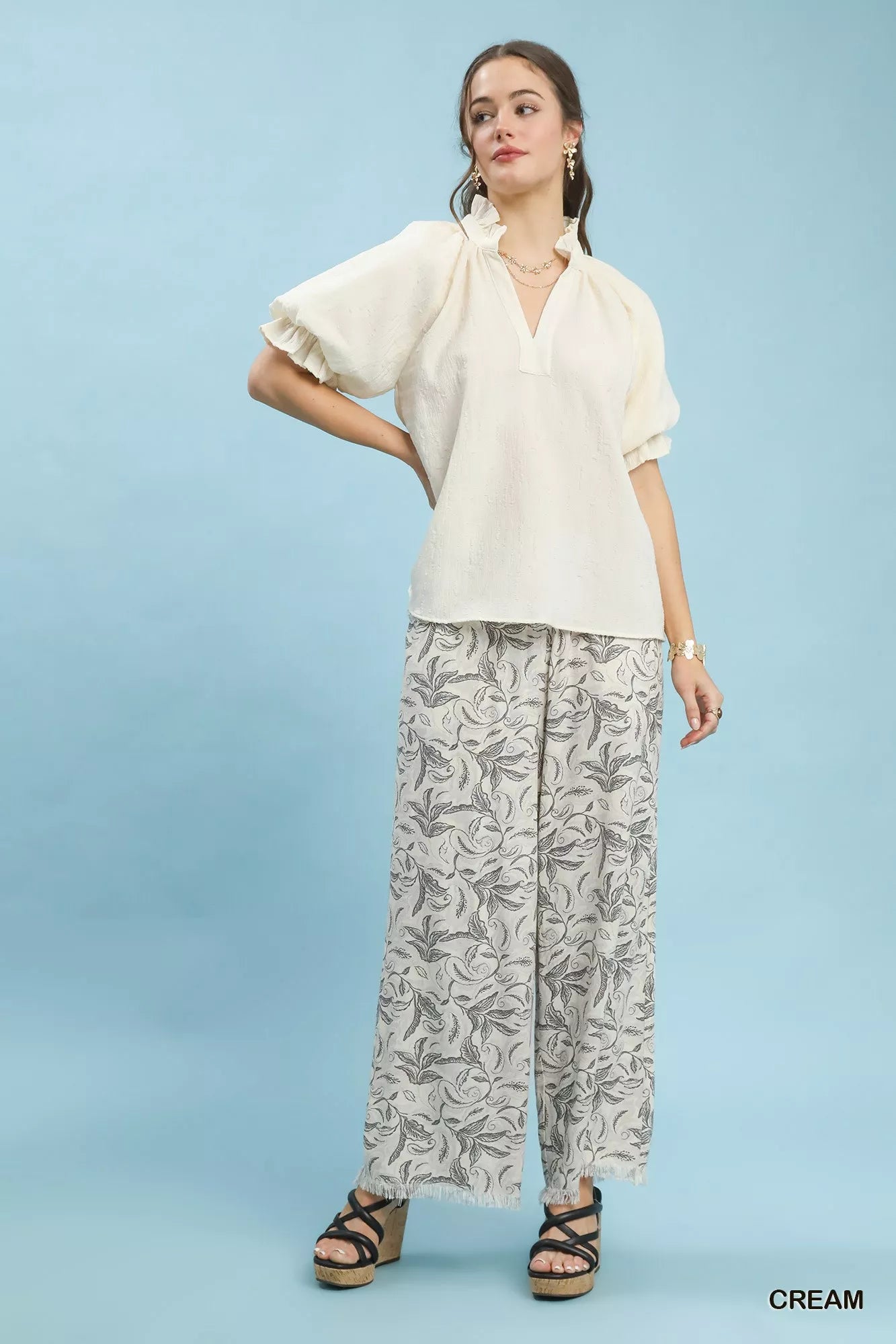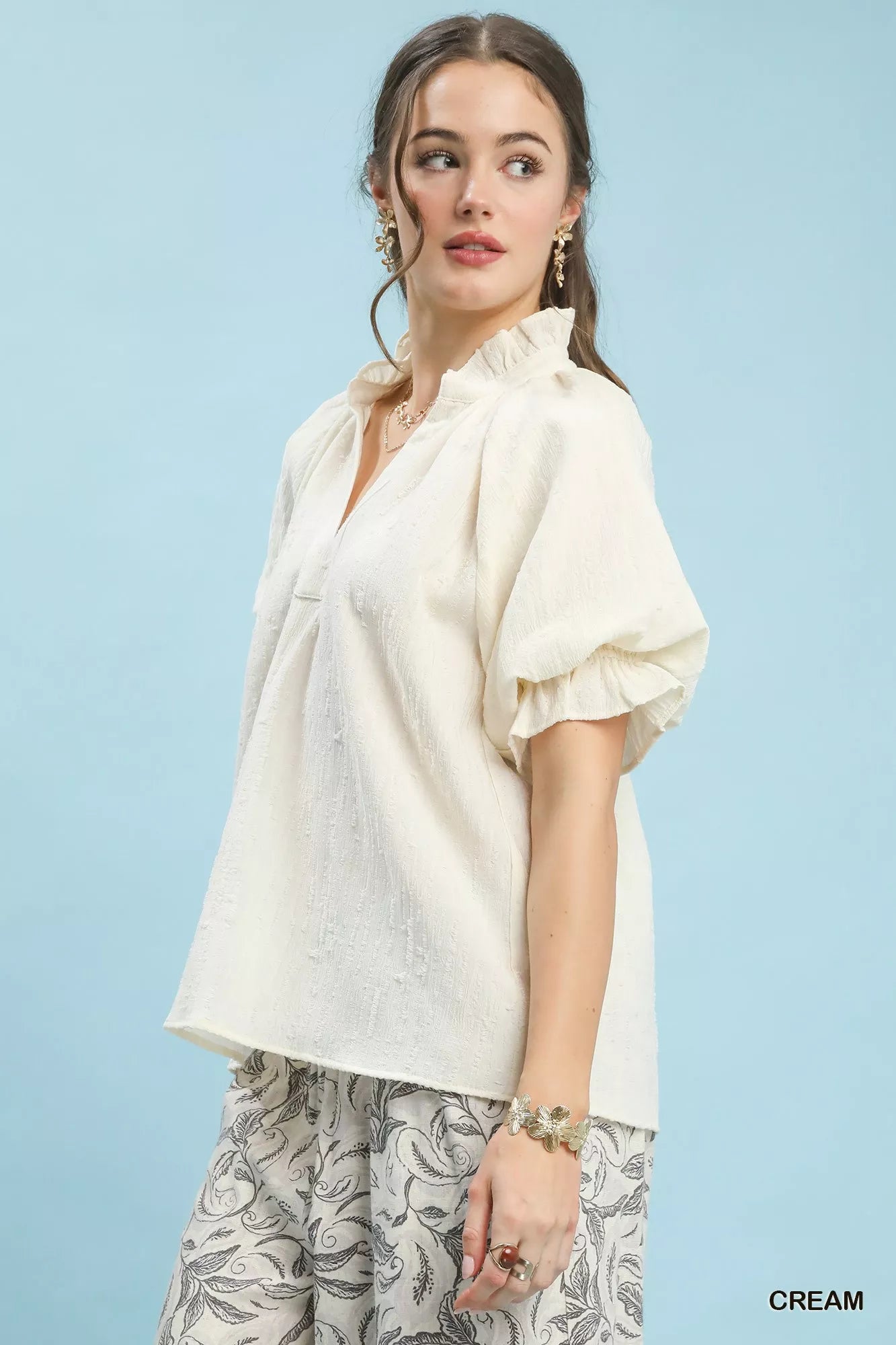 Elevate your wardrobe with the Textured Puff Sleeve Split Neck Top, a sophisticated and versatile piece. Crafted from subtle textured woven fabric, this top exudes an elevated look and feel. The split V-neck adds a modern touch to the design, perfect for adding a hint of elegance to your outfit. Featuring short puff sleeves, this top combines trendiness with a touch of femininity. Additionally, the sleeves are lined for added structure and comfort, making this top a stylish and practical choice for any occasion.