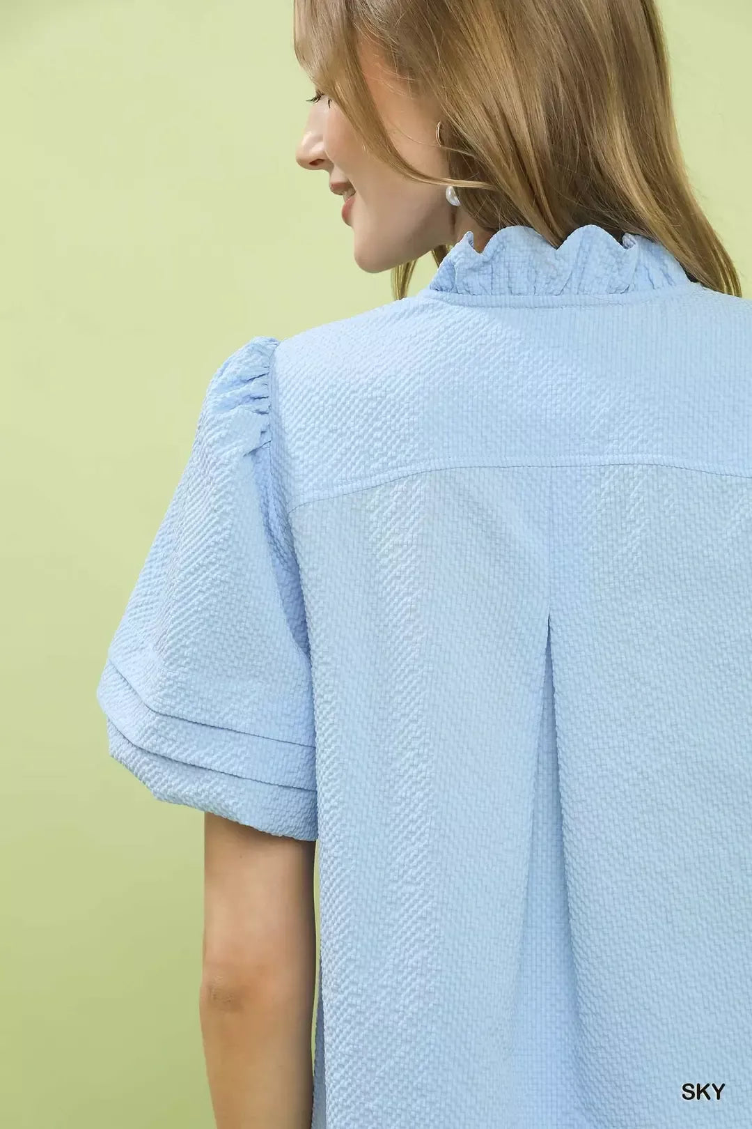 A textured scallop trim puff sleeve blouse features intricate scalloped detailing along the edges of the blouse, giving it a unique and stylish look. The puff sleeves add a touch of volume and drama to the overall design, creating a trendy and feminine silhouette. This blouse is perfect for adding a chic and sophisticated touch to any outfit, whether paired with jeans for a casual look or with dressier bottoms for a more formal ensemble. The textured fabric adds depth and interest to the blouse, making it a fashionable and versatile piece for your wardrobe. Elevate your style with this elegant and on-trend textured scallop trim puff sleeve blouse.
