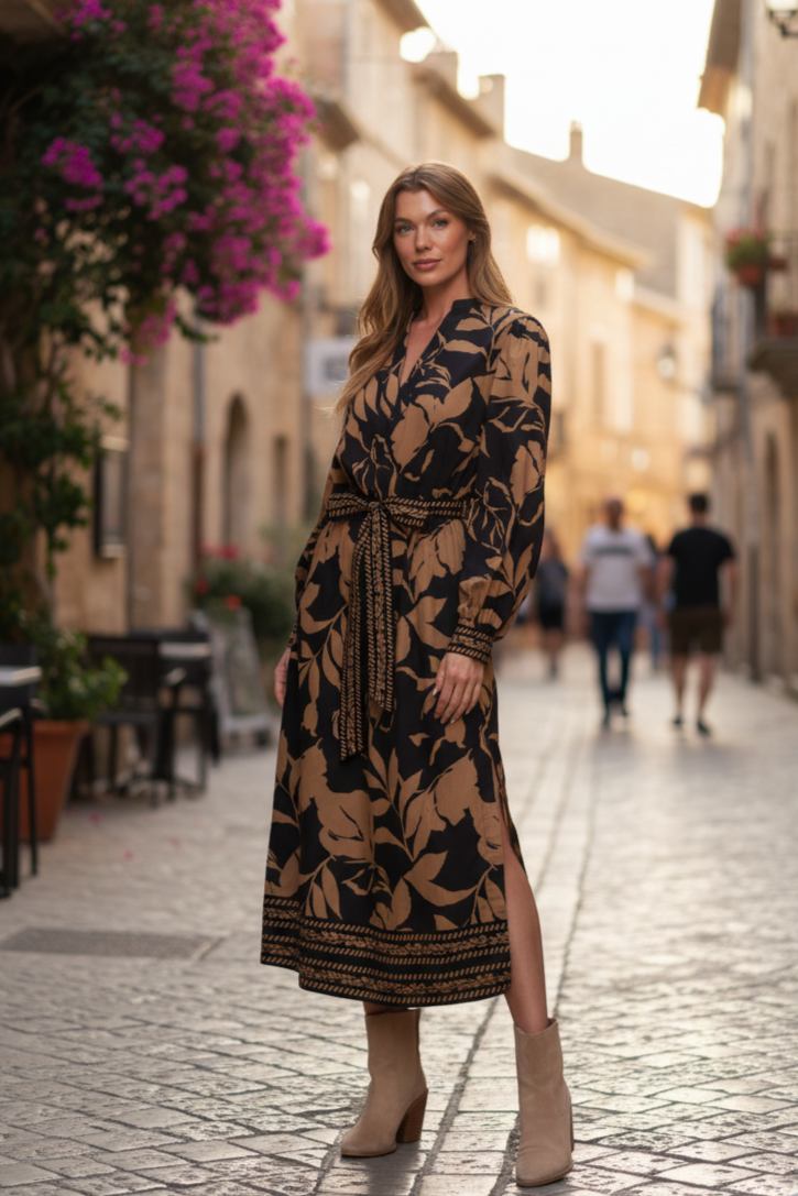 A printed woven midi dress featuring high neckline with V front, short puff sleeve and self sash tie