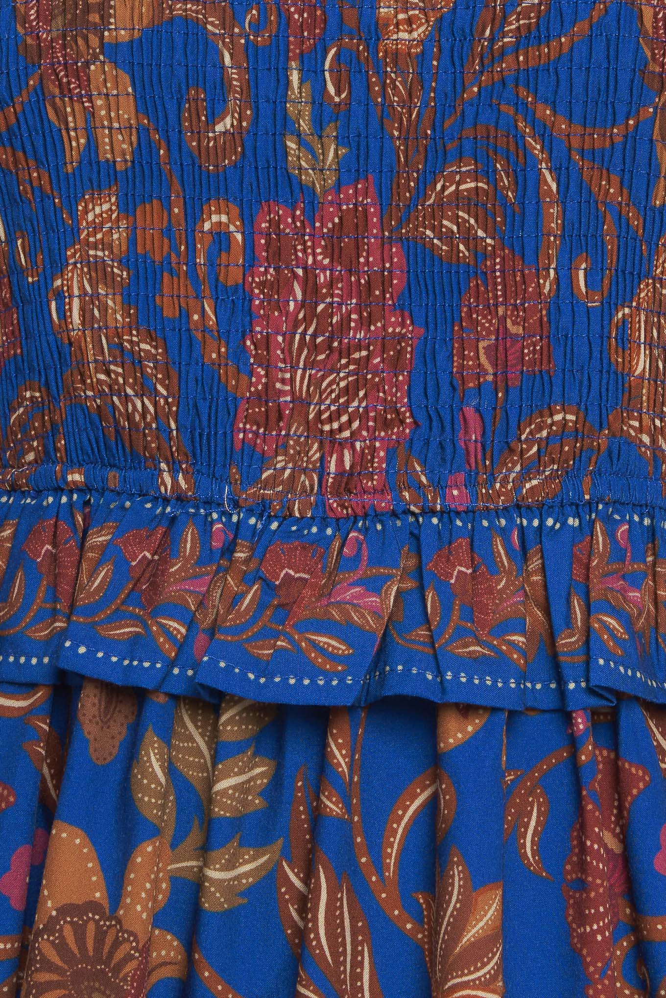 A printed woven midi dress featuring round neckline, smocked bodice, short puff sleeve, tiered skirt with ruffles and back neck button closure