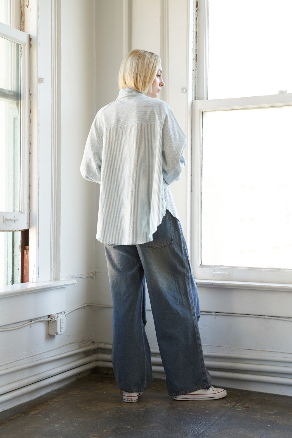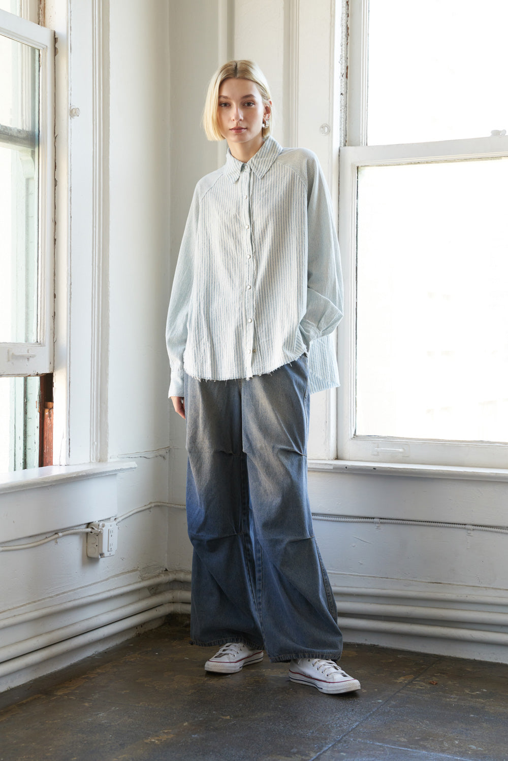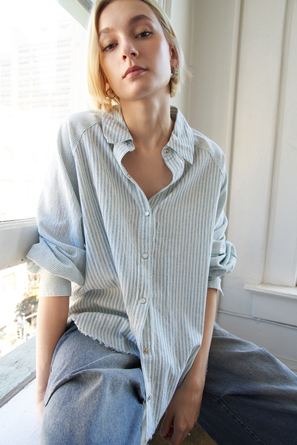 An oversized top featuring shirt collar, button down and long sleeve