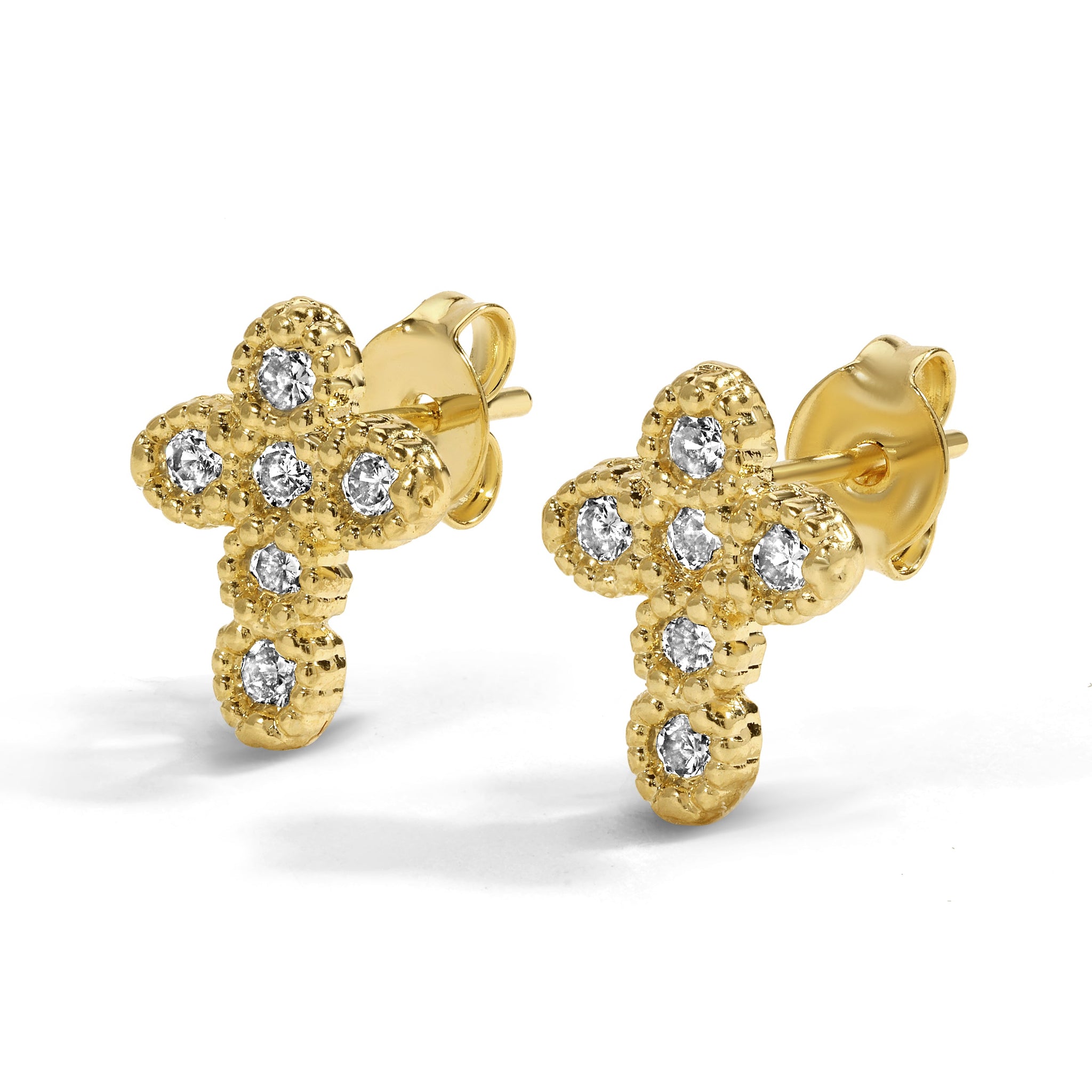 Timeless and radiant, these gold cross stud earrings are accented with sparkling stones for a touch of brilliance. The textured gold setting adds depth and dimension, giving the classic cross design a modern update. Perfect for everyday wear or special occasions, they bring both faith and fashion into one chic accessory. Lightweight and versatile, they’re an effortless staple for any jewelry collection.