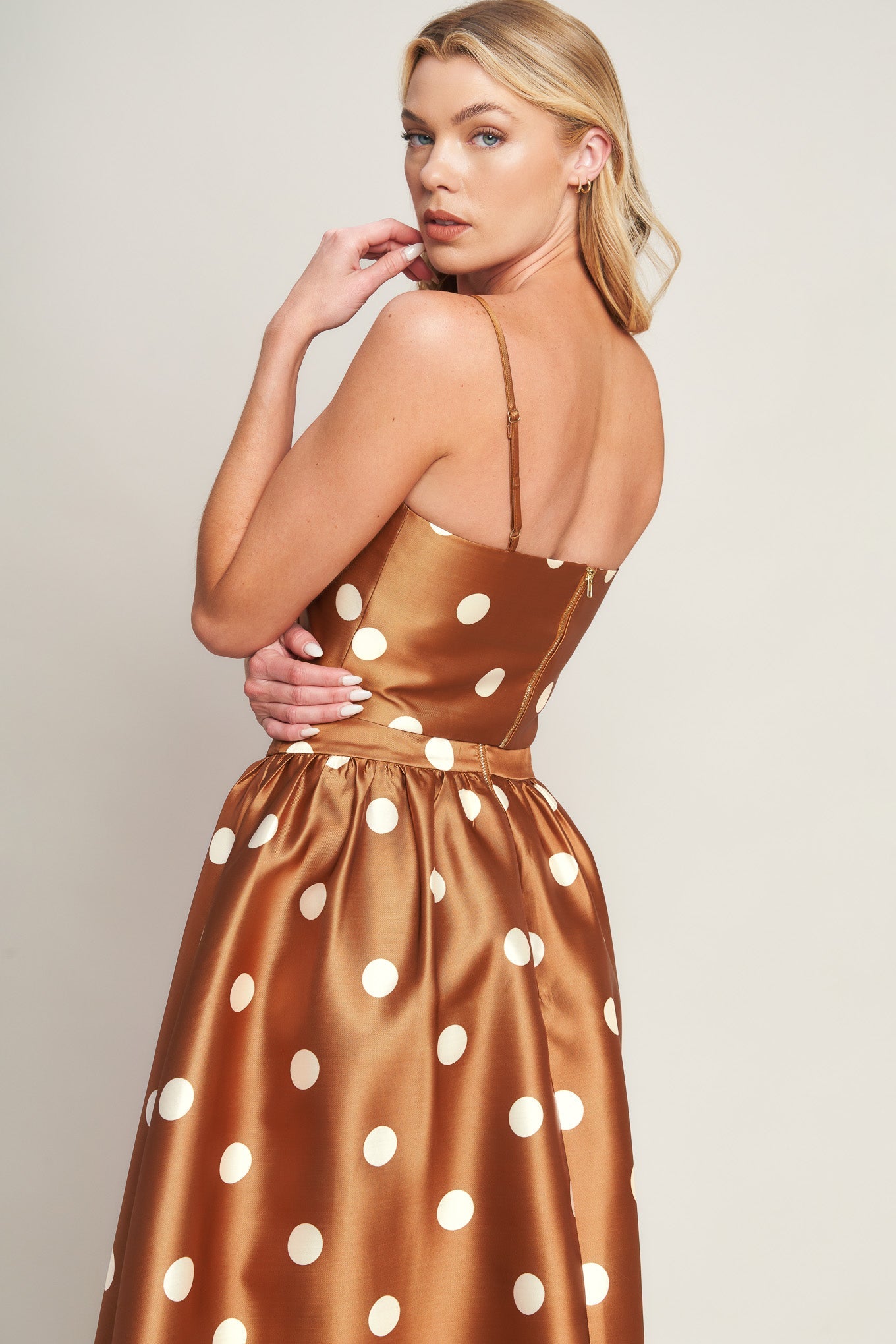 A printed woven top featuring straight neckline, straps and back zipper closure. Matching skirt IK7755T