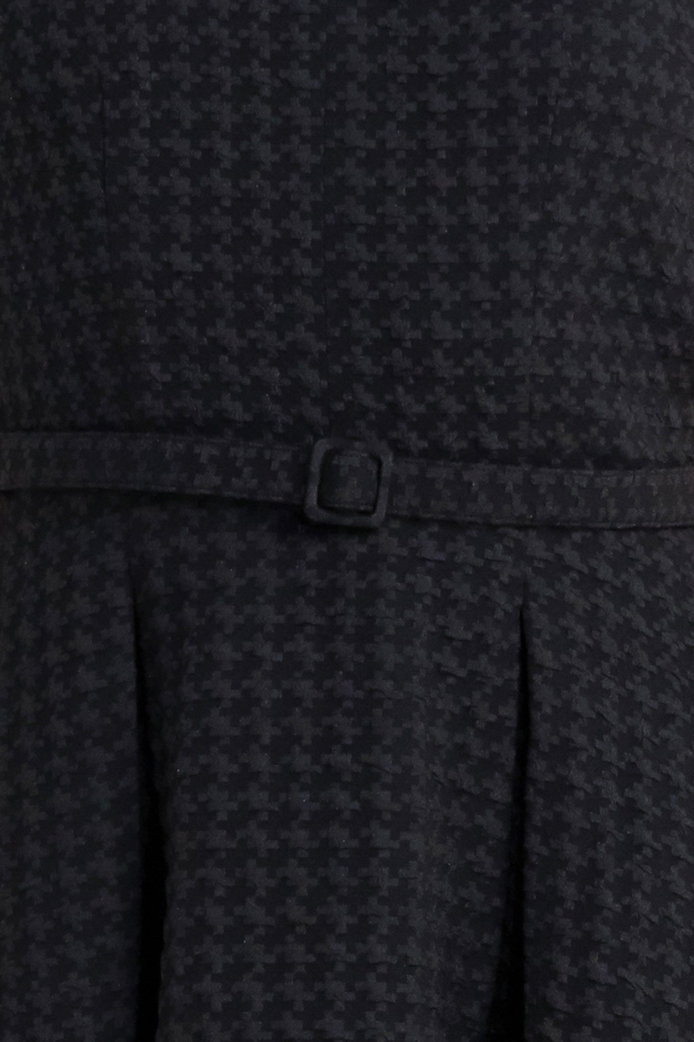 A textured woven midi dress featuring round neckline, center front button with cut out, short sleeve, full skirt, self belt and back zipper closure