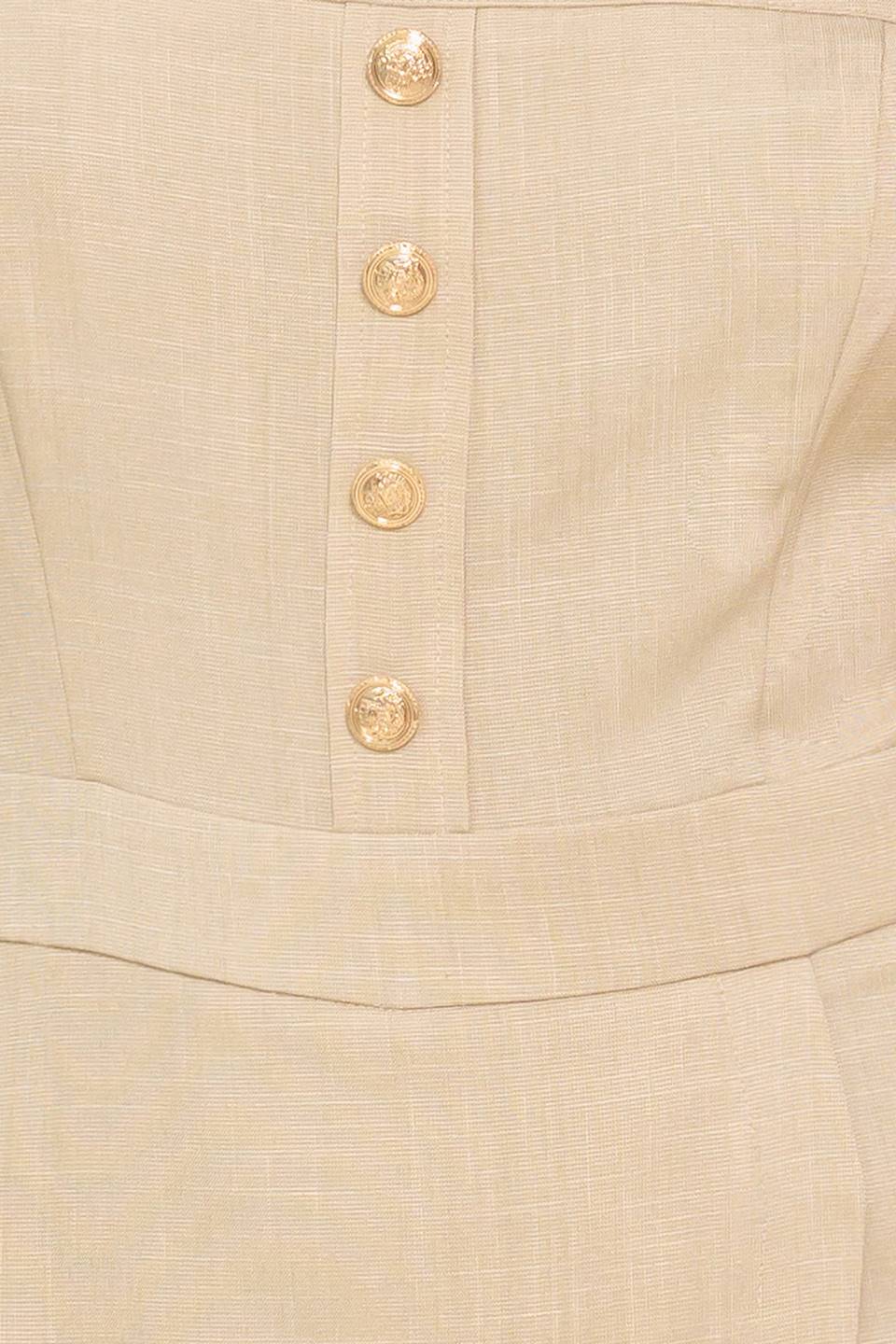 A solid woven romper featuring straight neckline, straps, front button detail, skort bottom and back zipper closure